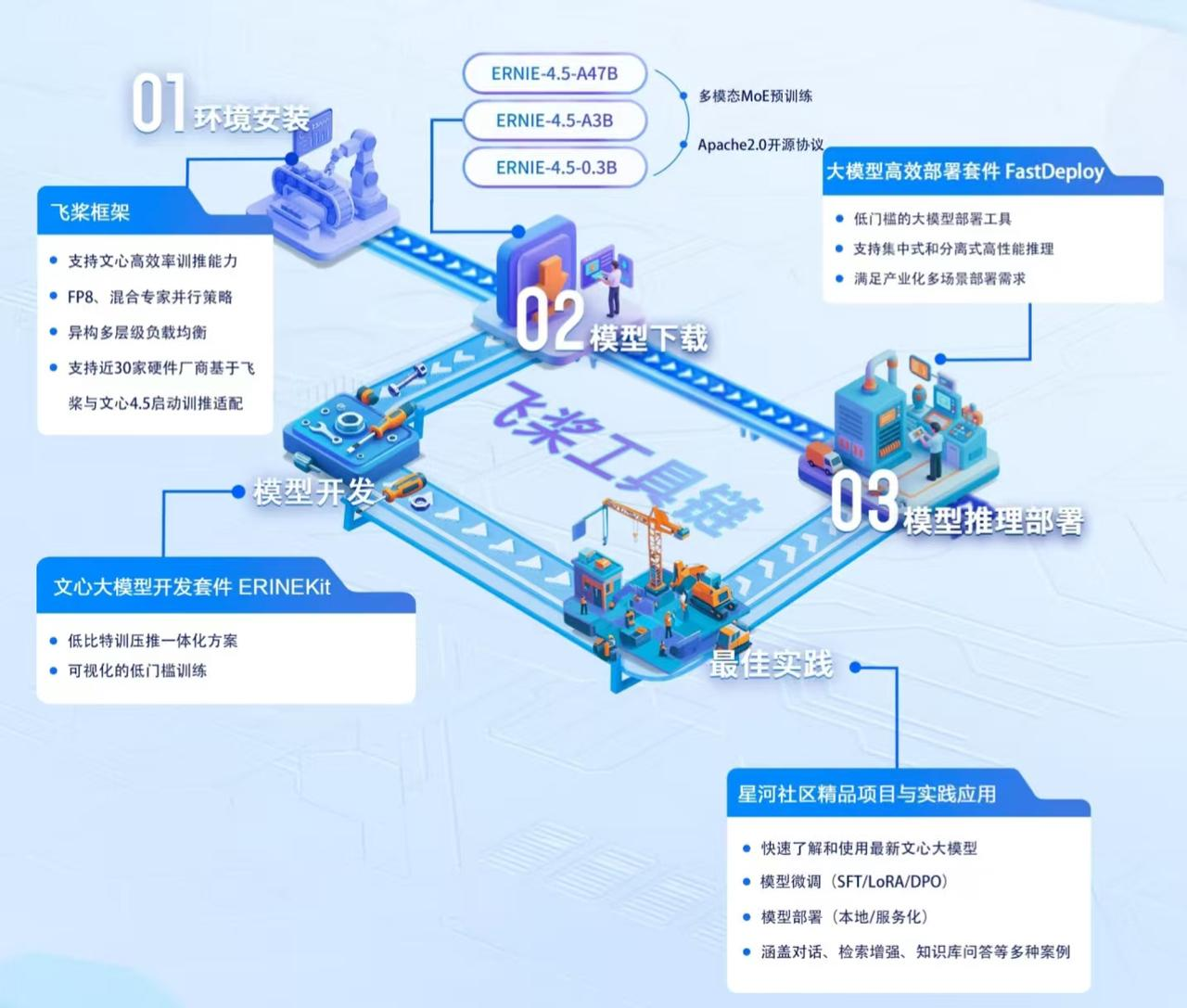 文心 ERNIE-4.5 的开源不仅给我们带来了高性能模型,更构建了从训练到部署的完整生态体系。通过 GitCode 开源平台的开放协作模式,开发者可直接获取模型代码。利用百度提供的 ERNIEKit 开发套件和 FastDeploy 部署工具即可轻松完成模型部署,大幅降低技术门槛,为模型精调、量化优化、多硬件适配提供全流程支持。