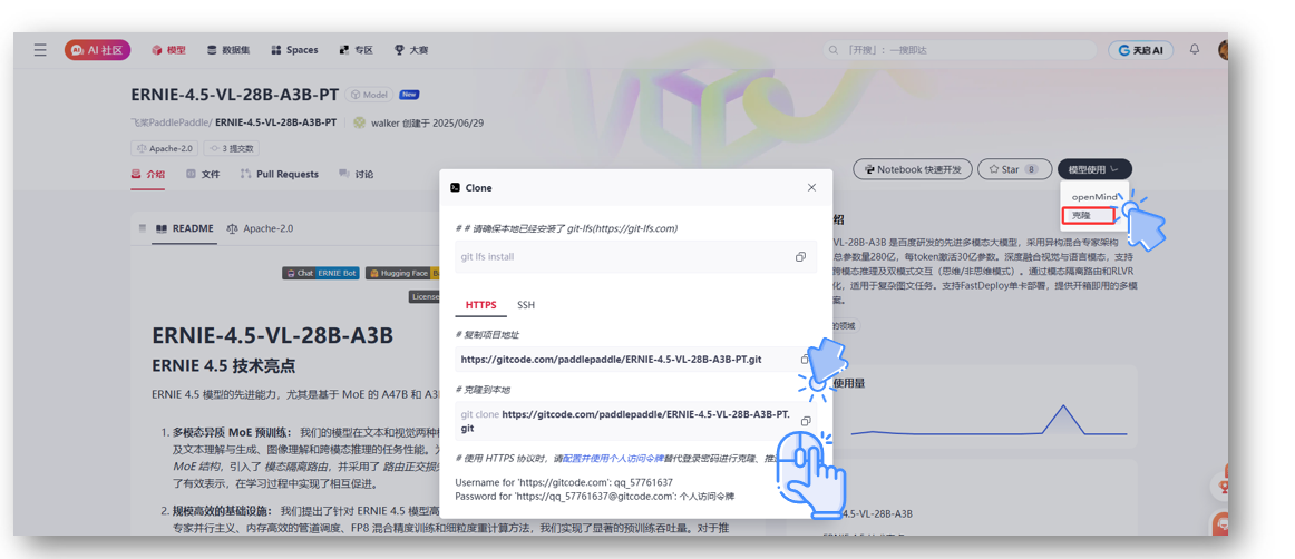 以上运行模型需要的环境就全部搭建好,其实整个过程还是非常简单了只需要输入几行命令5分钟就可以快速部署起来了,下面我们去gitcode拉取ERNIE-4.5-VL-28B-A3B-PT开源项目来一键部署