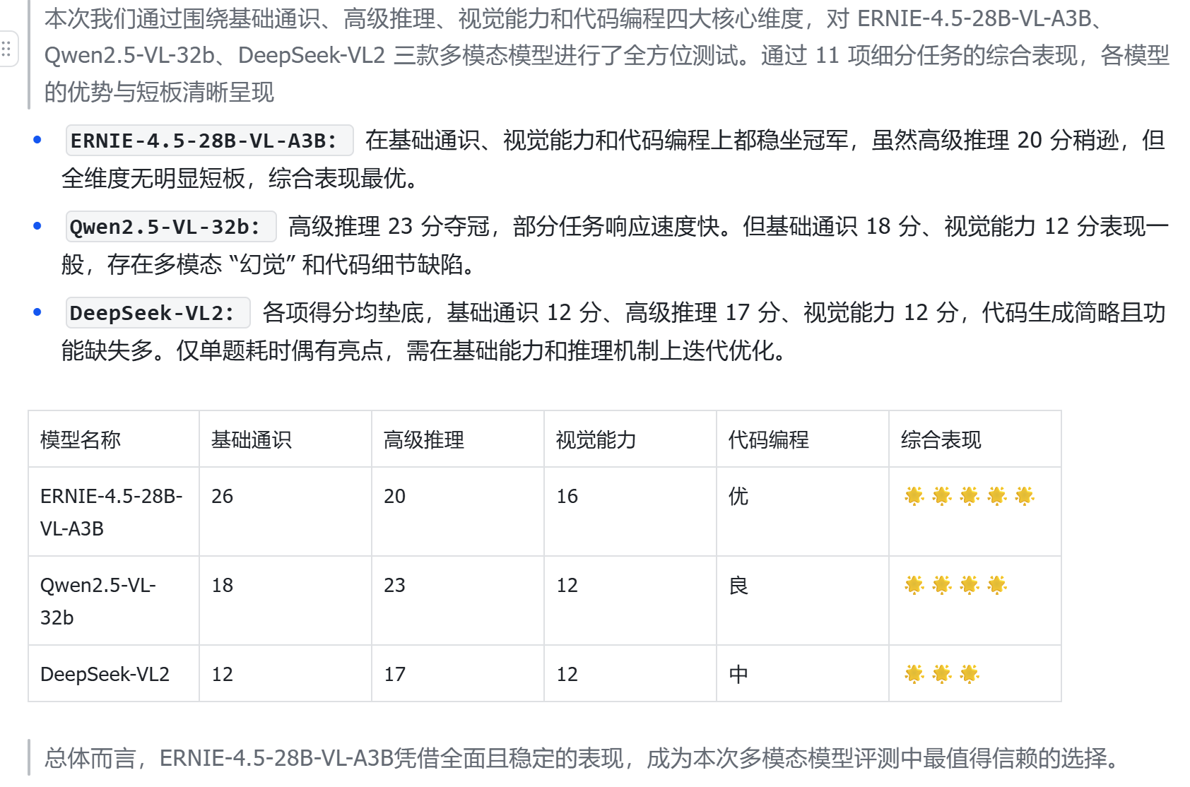 综合两项任务表现,ERNIE-4.5-28B-VL-A3B 以 “双任务全正确、细节分析到位、响应效率均衡” 的优异成绩,在本次视觉能力测试中脱颖而出,成功斩获视觉能力冠军;而 Qwen2.5-VL-32b 和 DeepSeek-VL2 则在复杂场景的准确性上暴露出不足,需在多模态推理的严谨性上进一步优化。