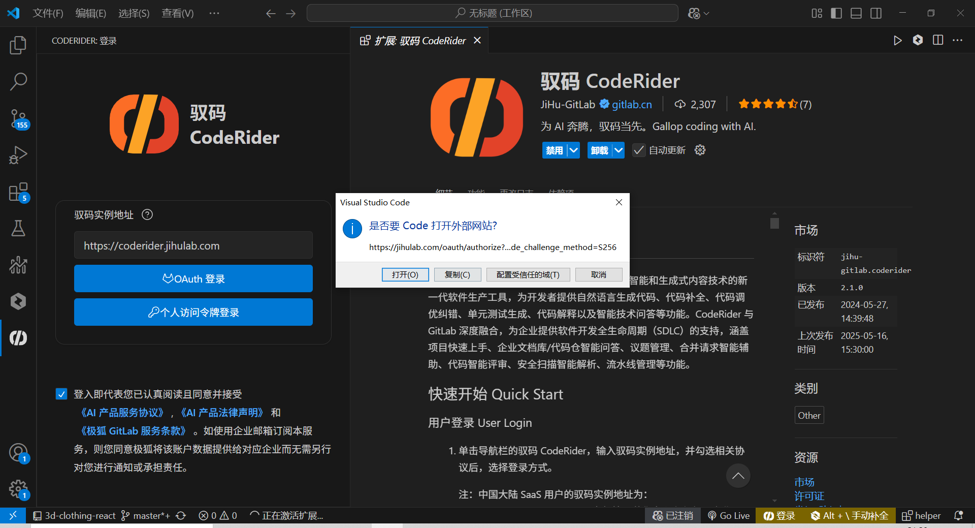 - 在跳转的 Web 网页端点击授权 CodeRider 后再次点击打开 Visual Studio Code。