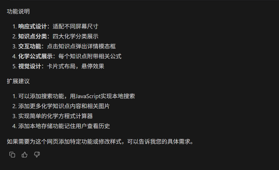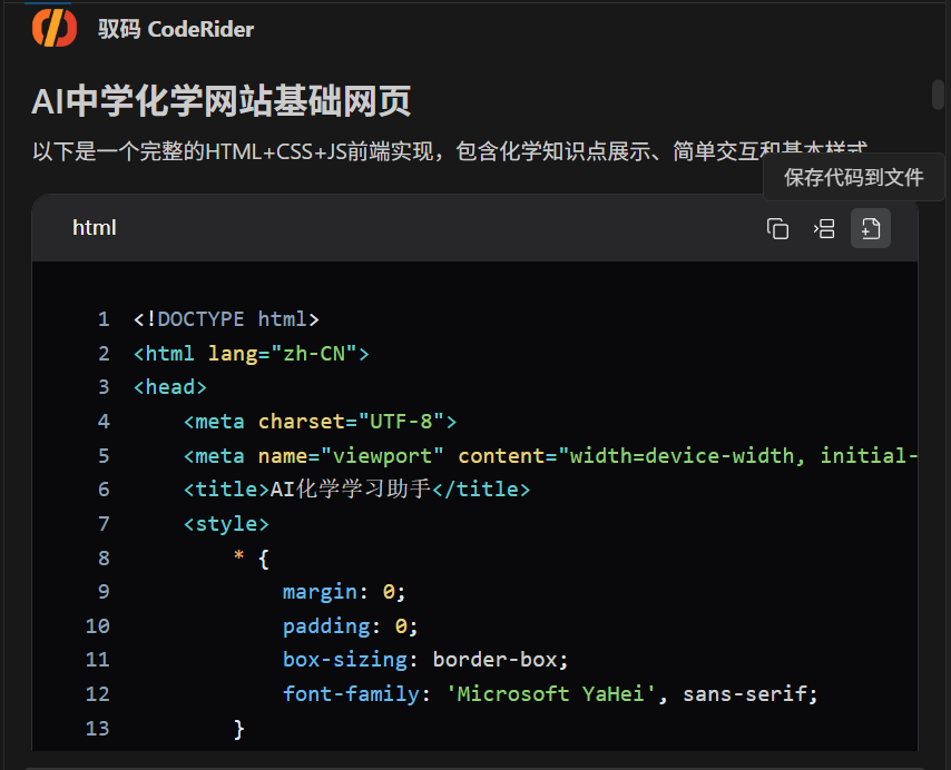 4、这里很快帮我生成了一个AI中学化学知识点网站的基础网页,还支持保存代码到文件