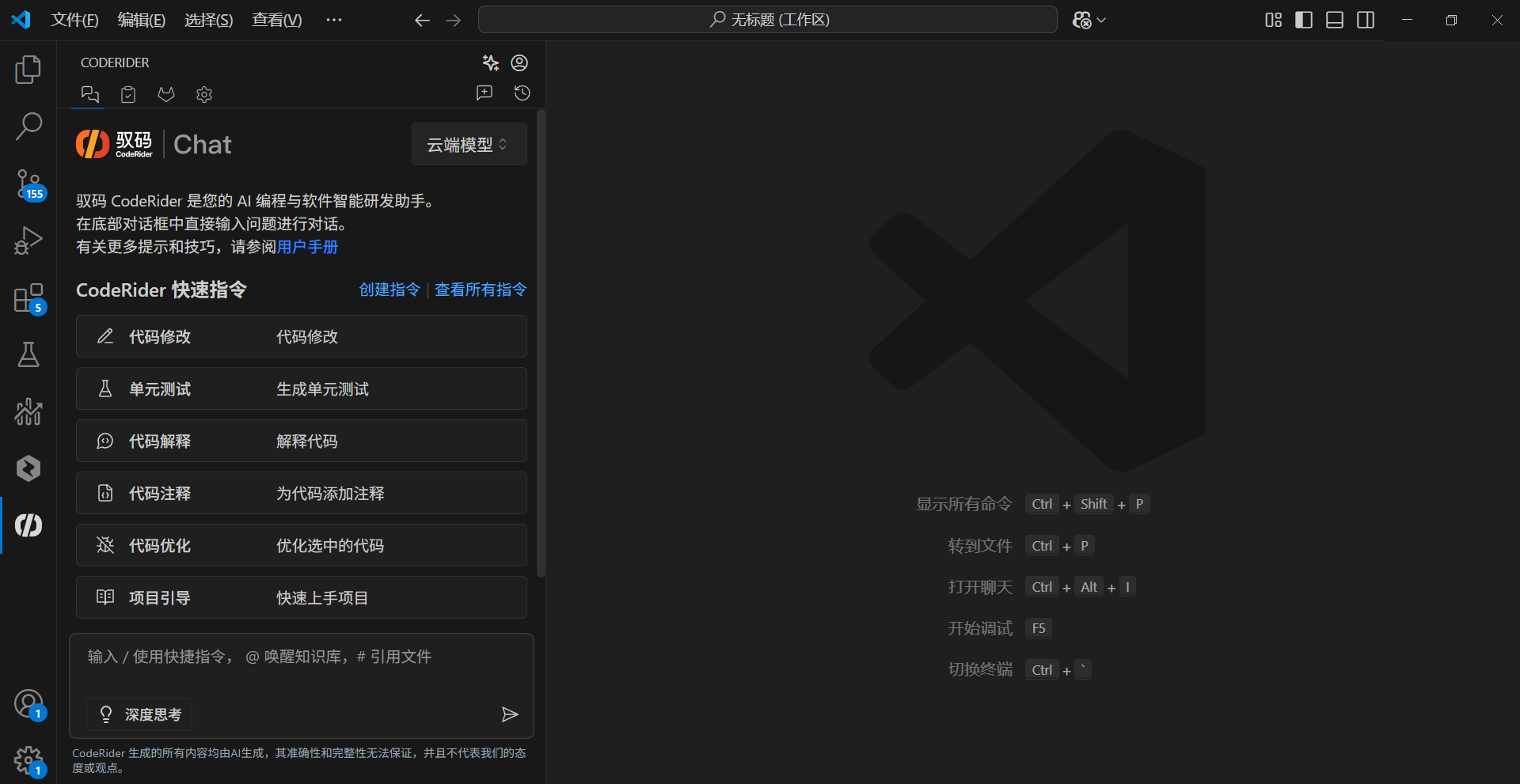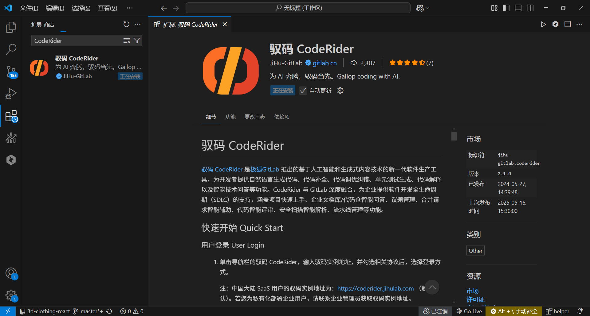2、打开 Visual Studio Code 扩展窗口,搜索“驭码 CodeRider”,找到插件后点击安装