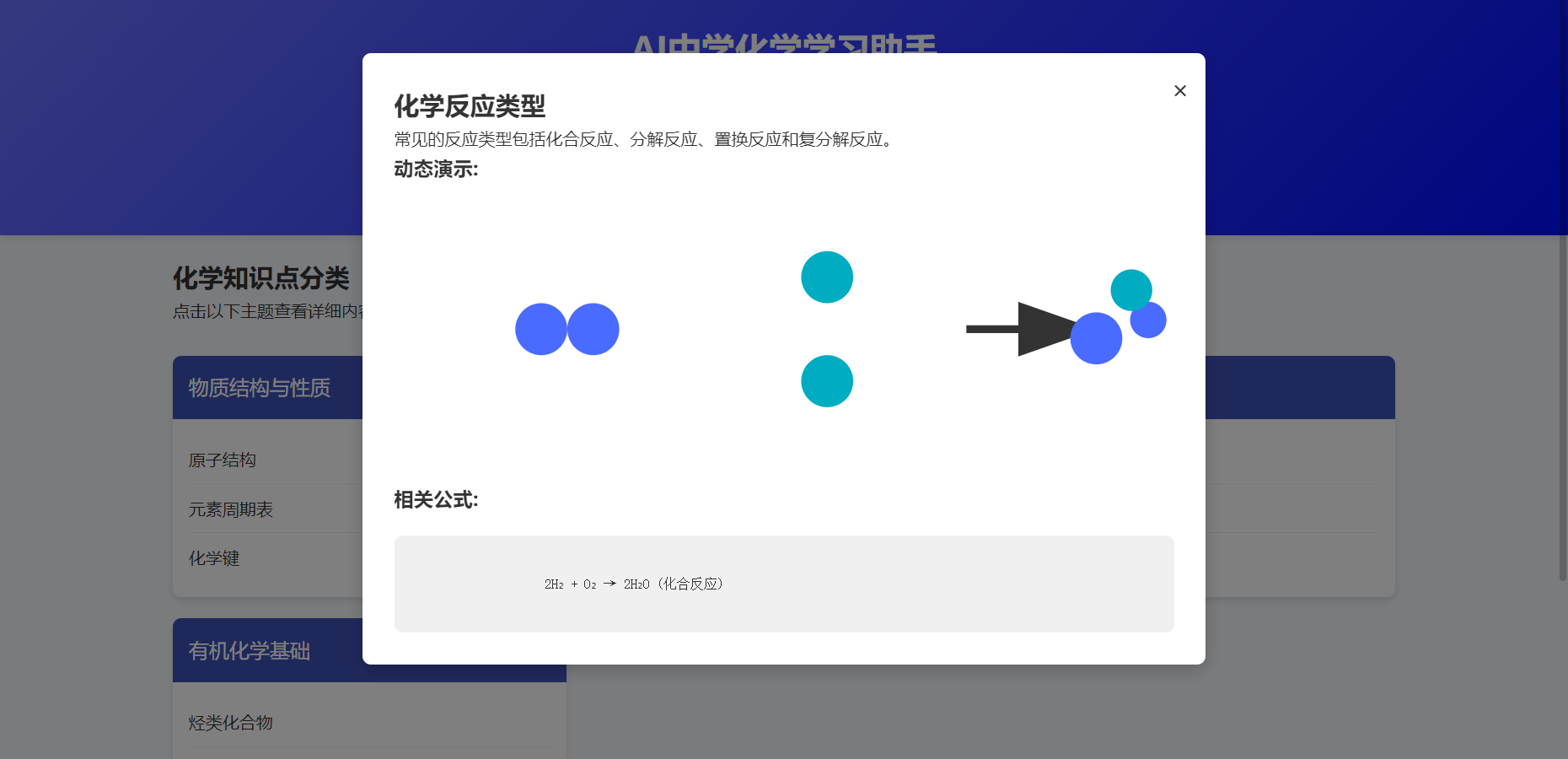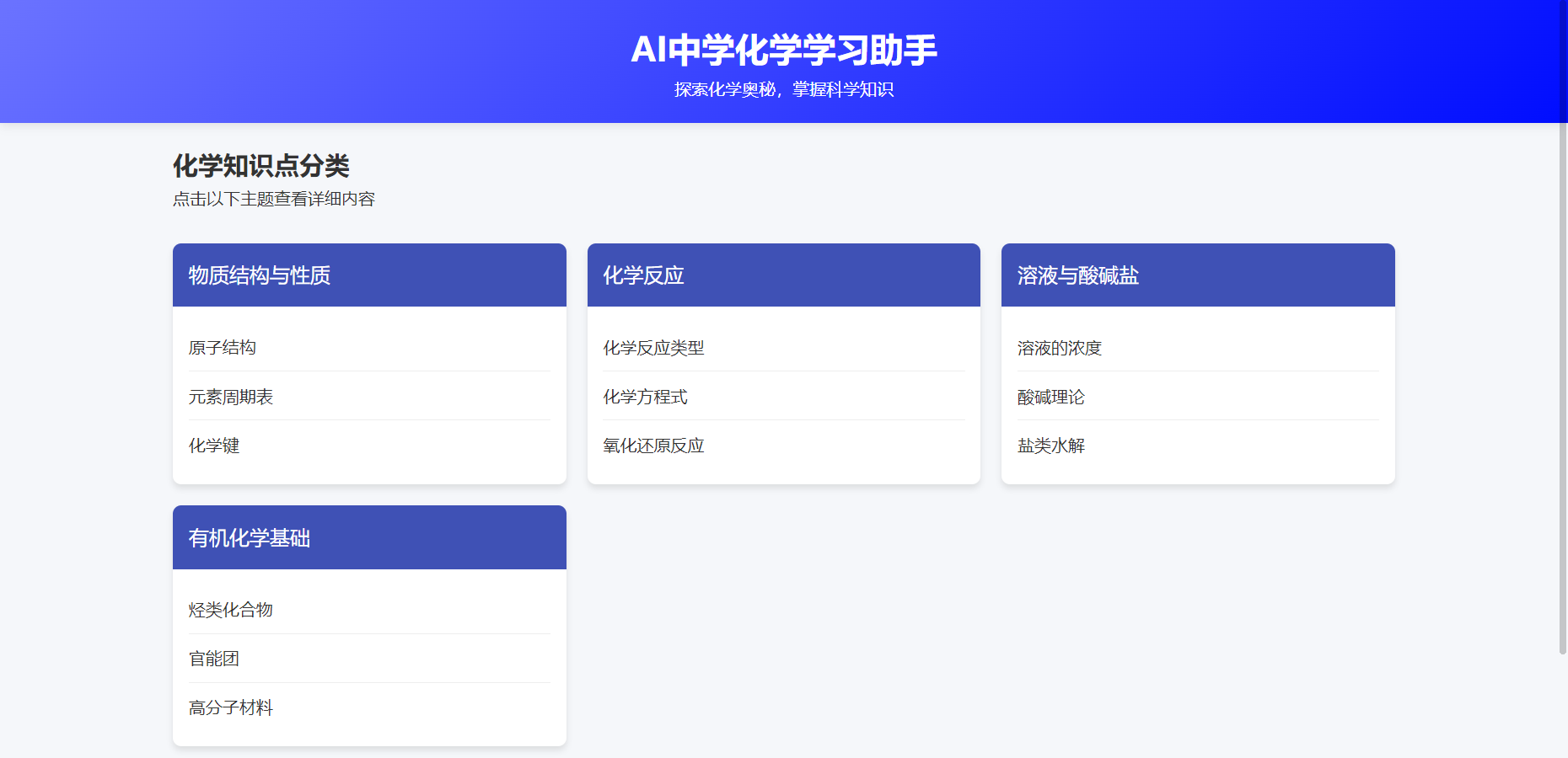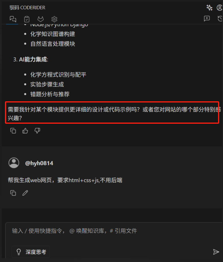 1、在输入框中提问:“帮我生成一个AI中学化学网站,要求内容包含中学化学的常见知识点”