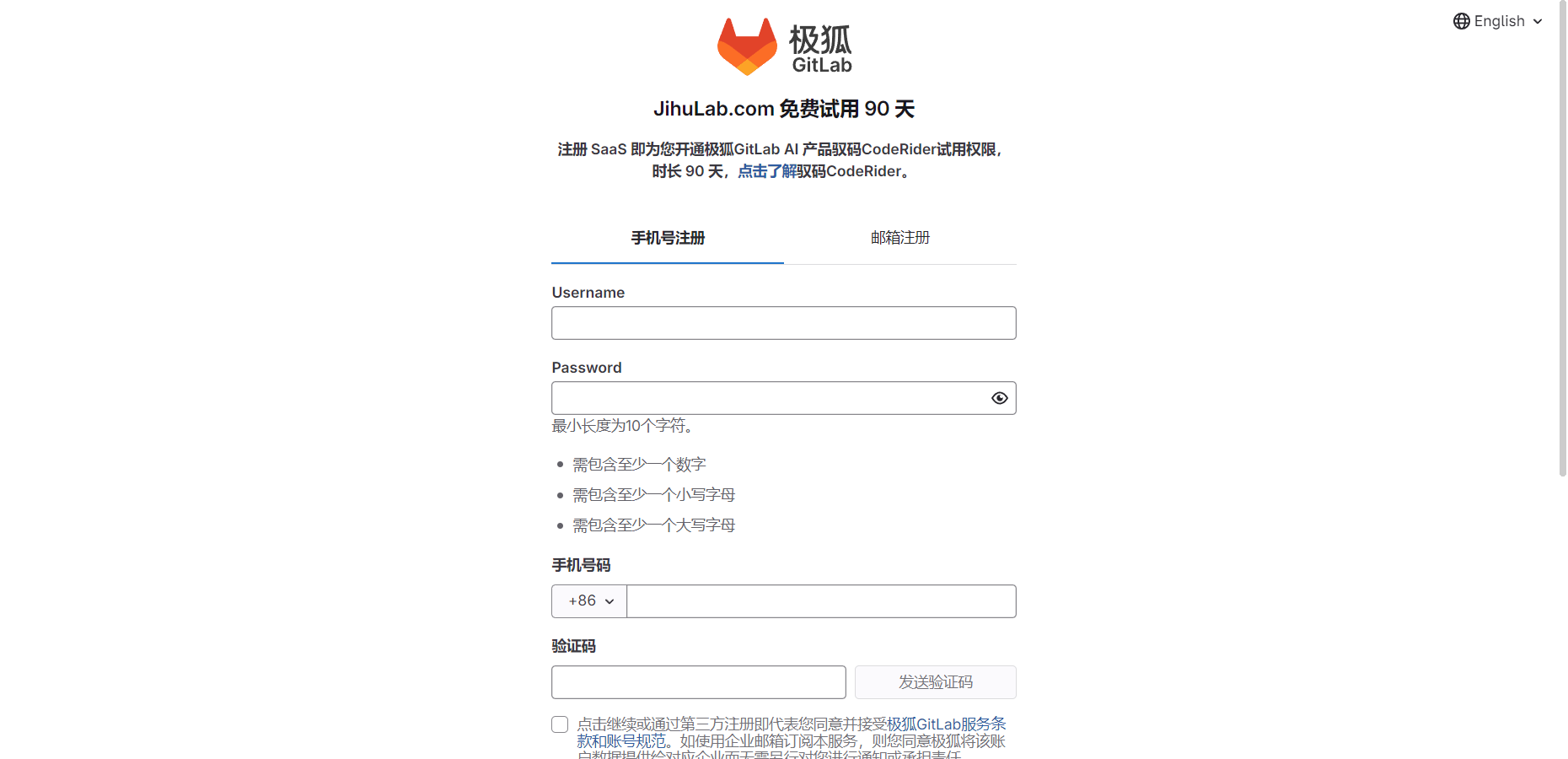 单击导航栏的驭码 CodeRider,输入驭码实例地址,并勾选相关协议后,选择登录方式。 注:中国大陆 SaaS 用户的驭码实例地址为:https://coderider.jihulab.com(默认)。
