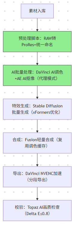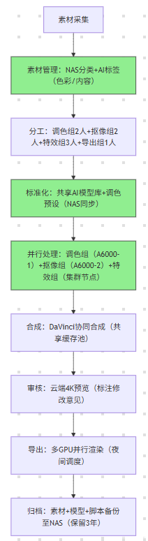 AI辅助8K后期的流程核心是“减少人工干预+显存负载均衡+团队协同标准化”,结合10个团队落地经验,设计分规模流程方案: