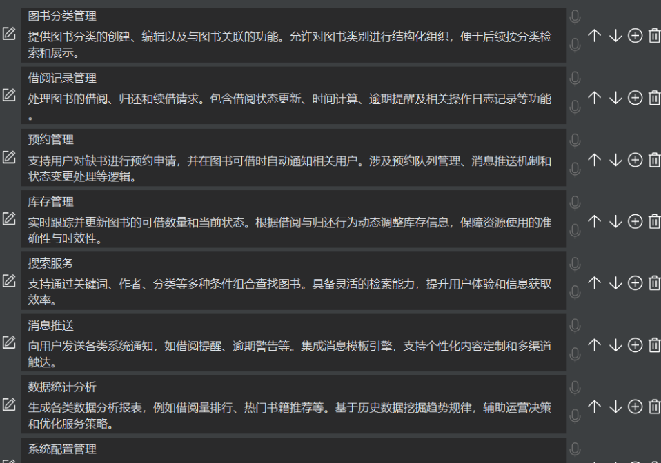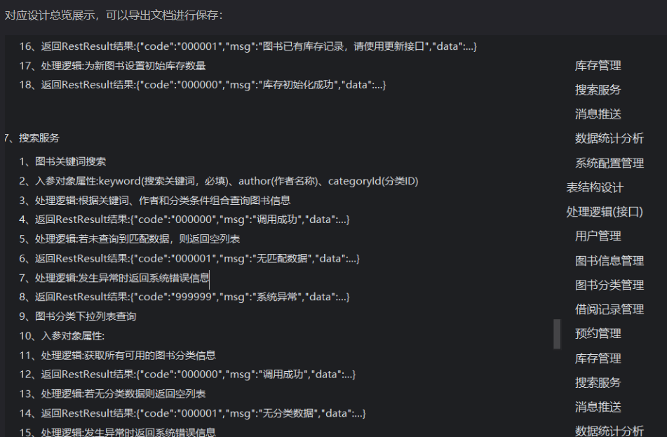 一共8个功能模块,分别是可创建编辑并与图书关联、进行结构化组织的图书分类管理;处理借阅、归还、续借及记录操作的借阅记录管理;支持缺书预约、自动通知等的预约管理;实时跟踪并更新可借数量与状态的库存管理;通过多种条件组合查找图书的搜索服务;发送借阅提醒等多种通知的消息推送;生成数据分析报表辅助决策的数据统计分析;提供基础参数与系统规则配置的系统配置管理,同时提及基于需求生成10个接口方案且支持自定义优化。