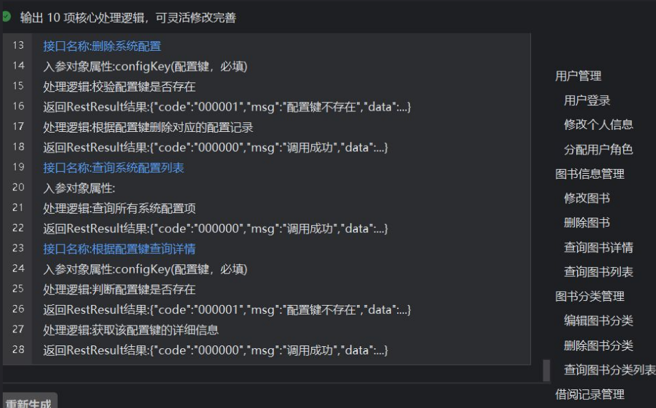 一共10项核心处理逻辑,包括删除系统配置(需校验配置键是否存在,存在则删除并返回对应结果)、查询系统配置列表(查询所有配置项并返回结果)、根据配置键查询详情(先判断配置键是否存在,存在则获取详细信息并返回结果)等接口的处理逻辑及返回的RestResult结果示例,右侧还罗列了用户管理、图书信息管理等相关功能模块。