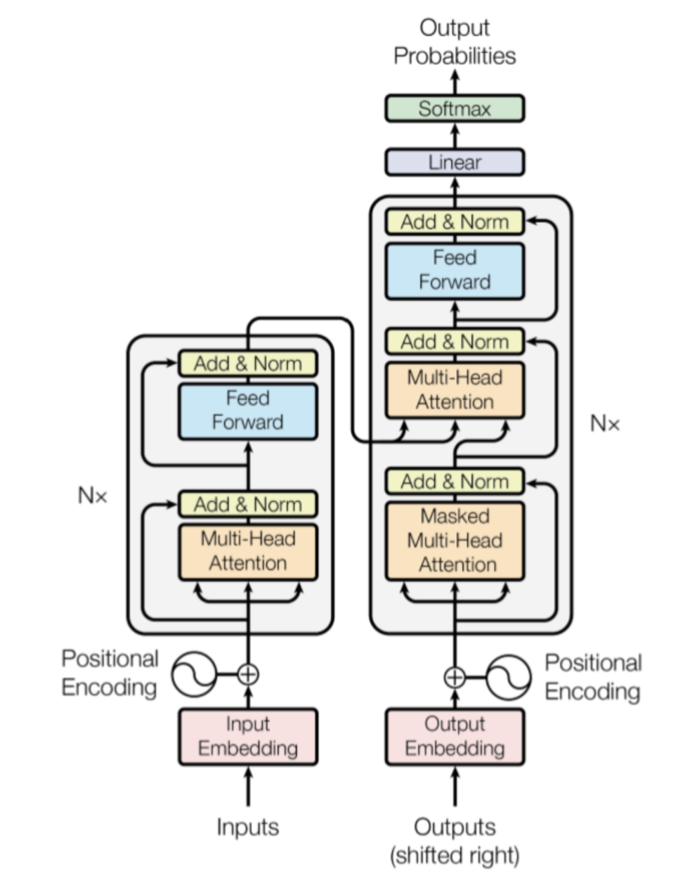 左侧和右侧分别对应编码器(Encoder)和解码器(Decoder)结构,它们均由若干个基本的 Transformer 块(Block) 组成(对应图中的灰色框)。这里 N× 表示进行了 N 次堆叠。每个 Transformer 块都接收一个向量序列 作为输入,并输出一个等长的向量序列作为输出 。这里的 和 分别对应文本序列中一个词元(Token)的表示。 是当前 Transformer 块对输入 进一步整合其上下文语义后对应的输出。在从输入 到输出 的语义抽象过程中,主要涉及如下几个模块: