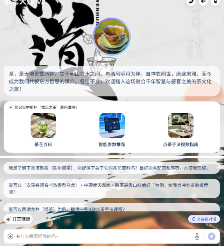 🎨 这篇文章呢,是关于一名热爱AI的普通人利用百宝箱MCP能力搭建生活服务方向智能体「茶艺大师-V2」的开发故事。志向是实现非遗茶道技艺的数字化传承与创新服务(咳咳,扯远了)。那么废话不多说,诸位道友,且听我娓娓道来~~~