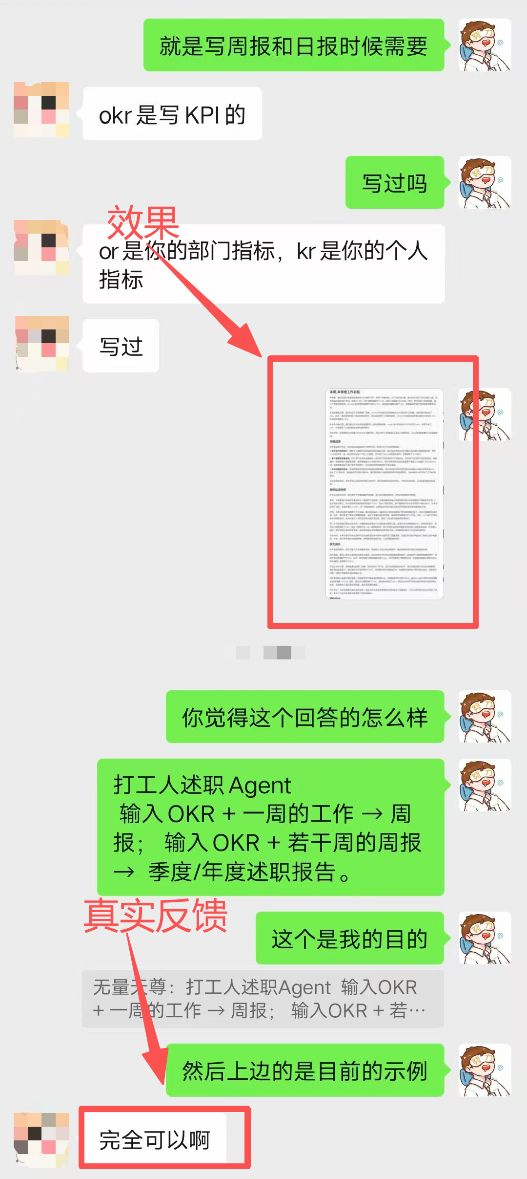 在制作完成后,我对效果挺满意的,但是一个人说了不行,我邀请朋友试用。作为同样需要频繁写材料的“牛马”,他反馈生成结果完全可以,准备下个 OKR 周期直接用这套流程。如果你也想制作这样的一个打工人述职Agent,可以跟着我下面来,接下来,我将手把手教你如何搭建打工人述职Agent。