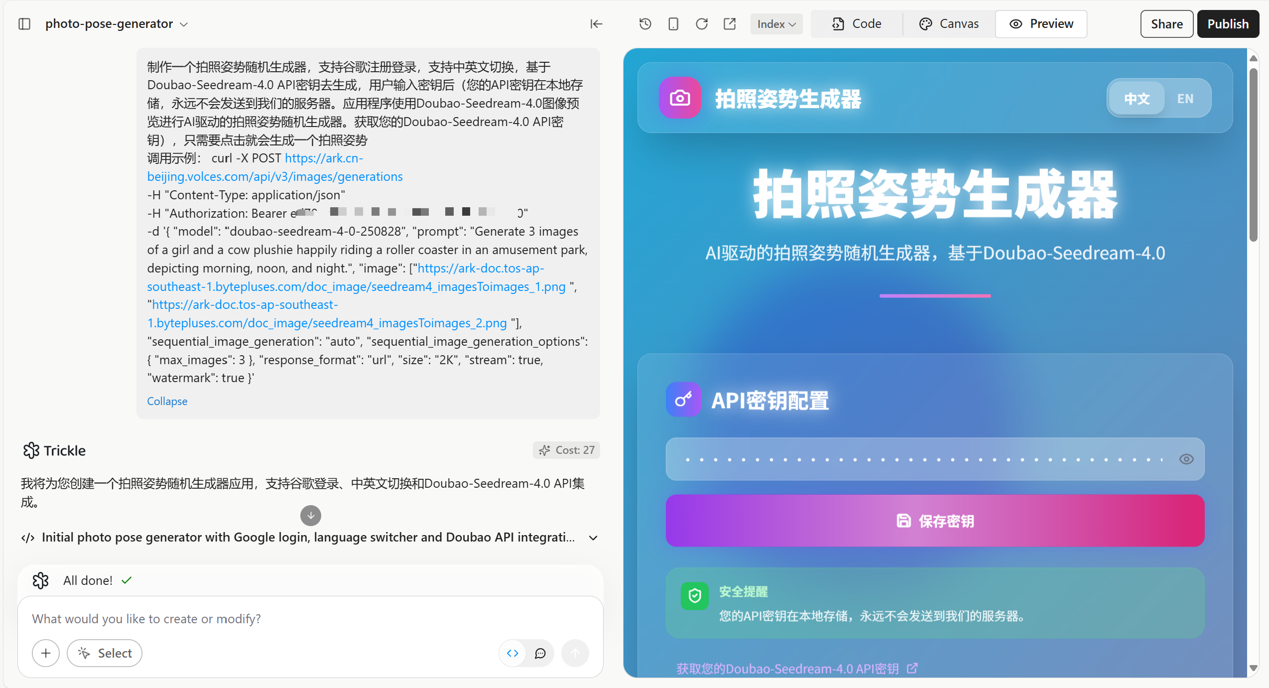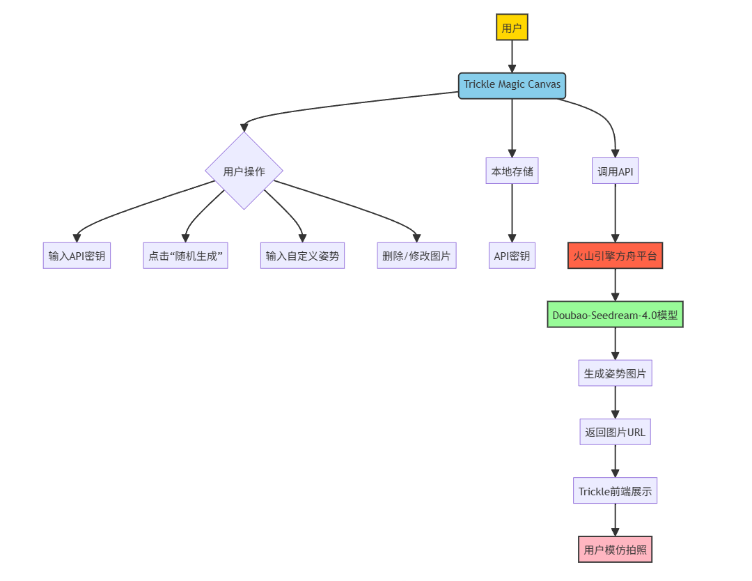 本文将带你从零开始,利用 Trickle Magic Canvas 可视化开发平台,结合 火山引擎方舟平台 提供的 豆包·Seedream-4.0 文生图大模型API,亲手打造一个智能拍照姿势生成器。它不仅能随机为你推荐创意姿势,还支持中英文切换、自定义输入、历史记录删除与局部修改,堪称你的私人AI摄影指导。