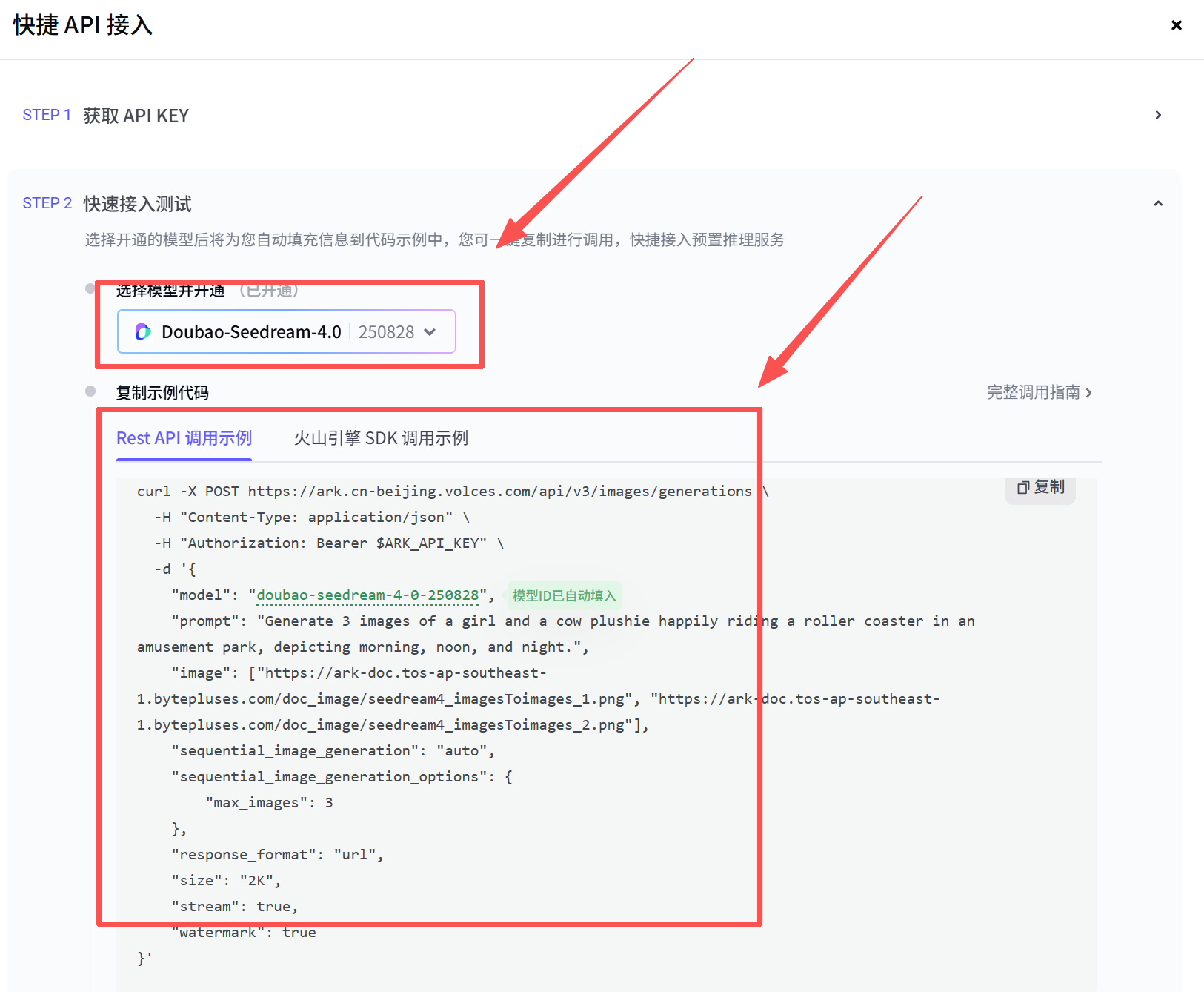 点击链接:https://www.volcengine.com/experience/ark?launch=seedream,点击右上角的API接入