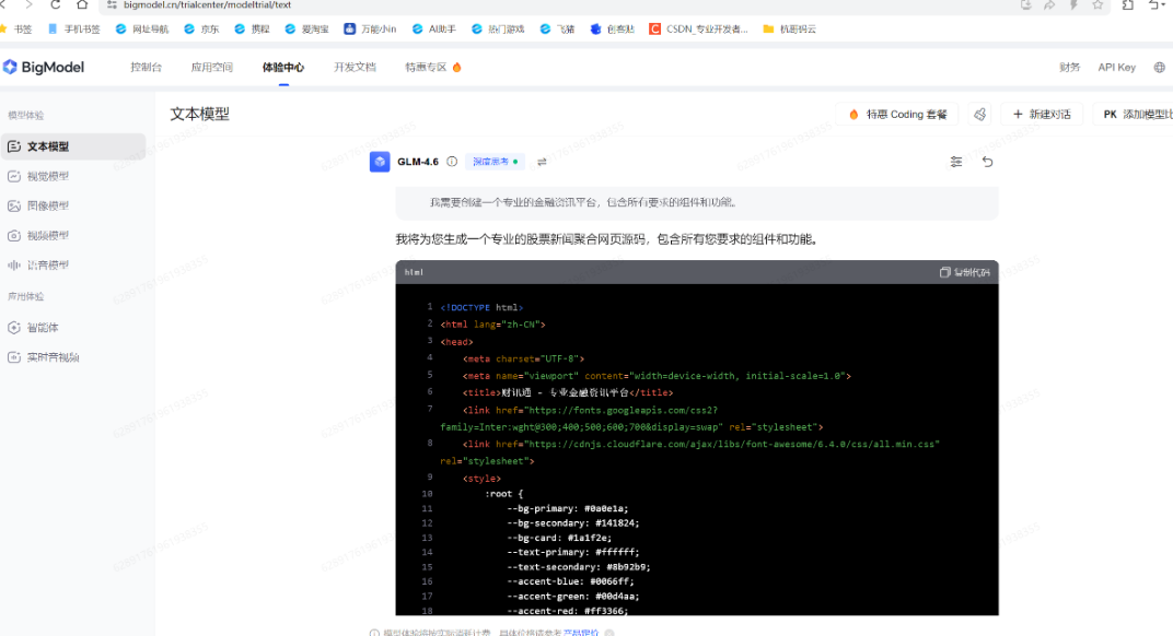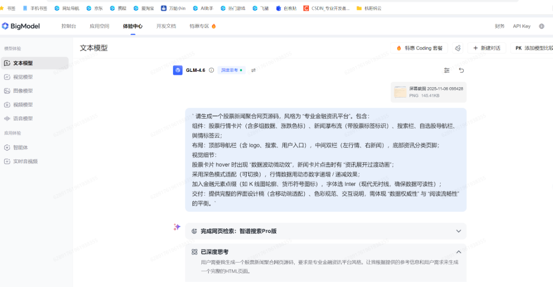 在智谱 AI GLM4.6 生成股票新闻聚合网页的体验中,我最深的感触是:它对金融场景的专业细节把控,细腻到超出预期,作为金融资讯类网页的原型,它已经能直接承载 “行情跟踪 + 资讯阅读” 的核心需求。更关键的是,它不是简单的界面拼接,而是真的理解了金融领域 “数据要准、交互要顺、视觉要专业” 的底层逻辑 —— 用 AI 做专业场景的网页原型,这效率和质感,确实超出了我的期待!