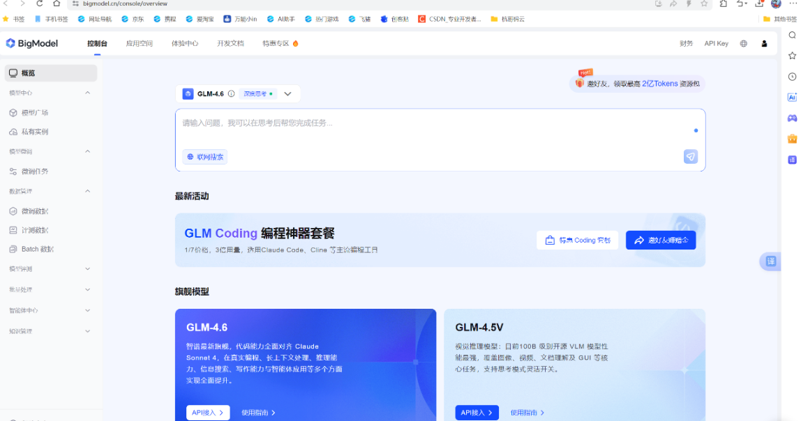 打开网页,完成登录,目前登录就送对话Token!https://bigmodel.cn/console/overview