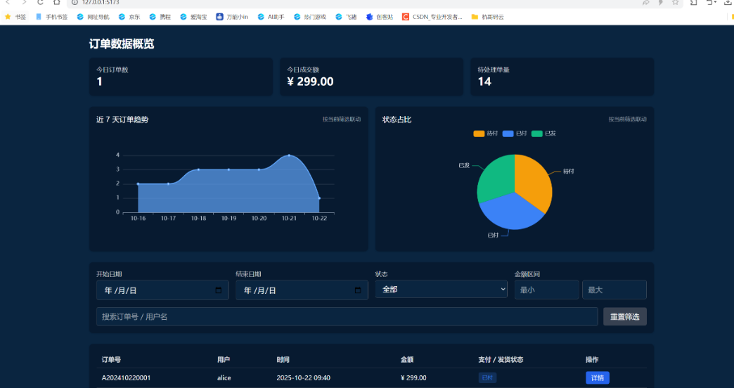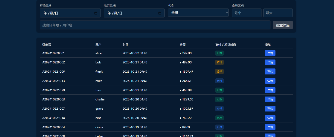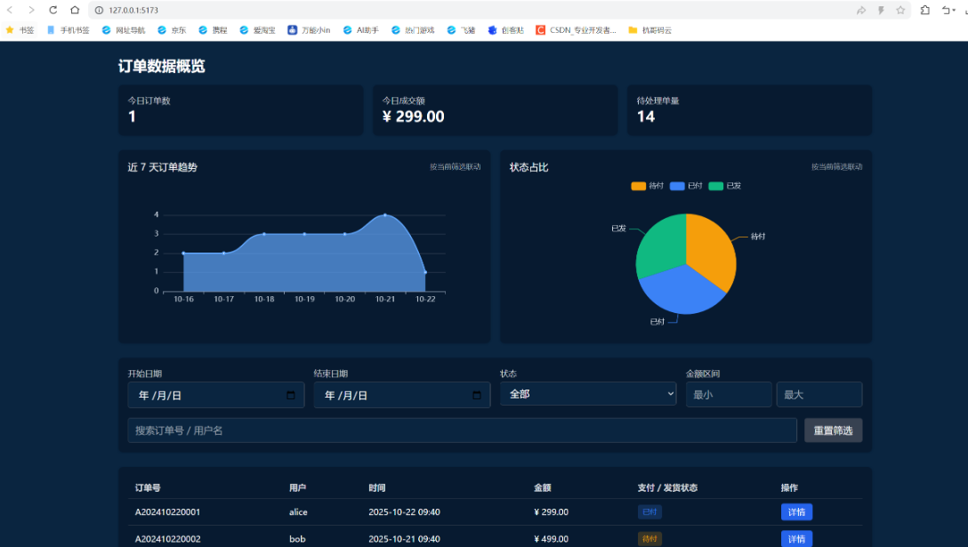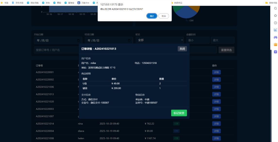 结果真是惊到我了,不到十分钟,一个功能齐全的页面框架就生成了,连模拟数据都给准备好了。我随手试了下筛选,选了“近7天”和“已付款”,数据瞬间就刷新了,翻页也特别顺滑,一点不卡。点开详情看,信息排得清清楚楚,连“标记发货”都加了二次确认,这种小细节最怕误操作了,它给考虑到了。最绝的是那个数据图表,我点了一下饼图的“已发货”,列表竟然真的跟着筛选了,这交互太智能了。