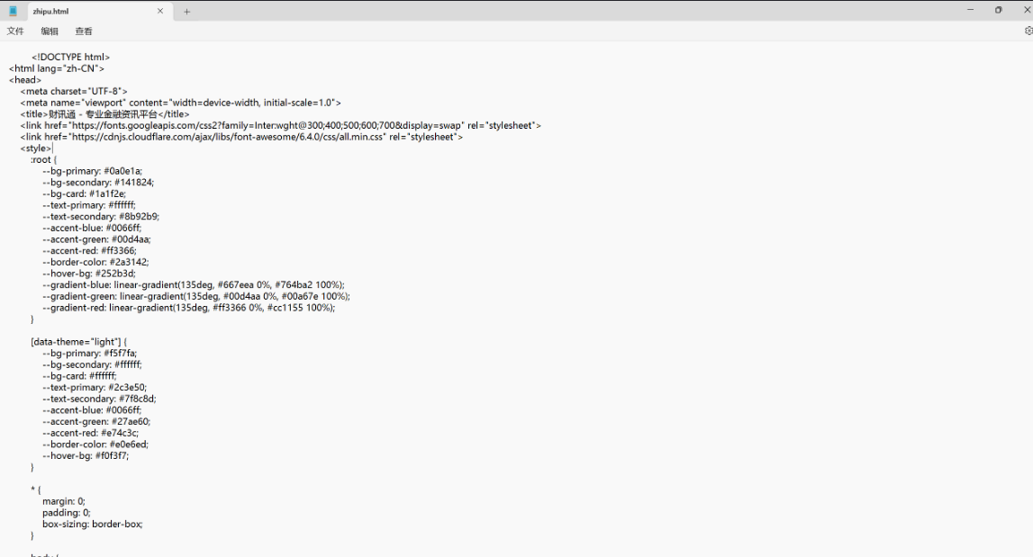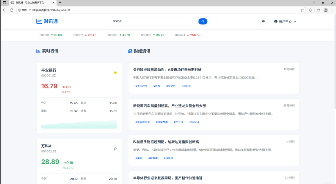 ` 请生成一个股票新闻聚合网页源码,风格为 “专业金融资讯平台”。包含: