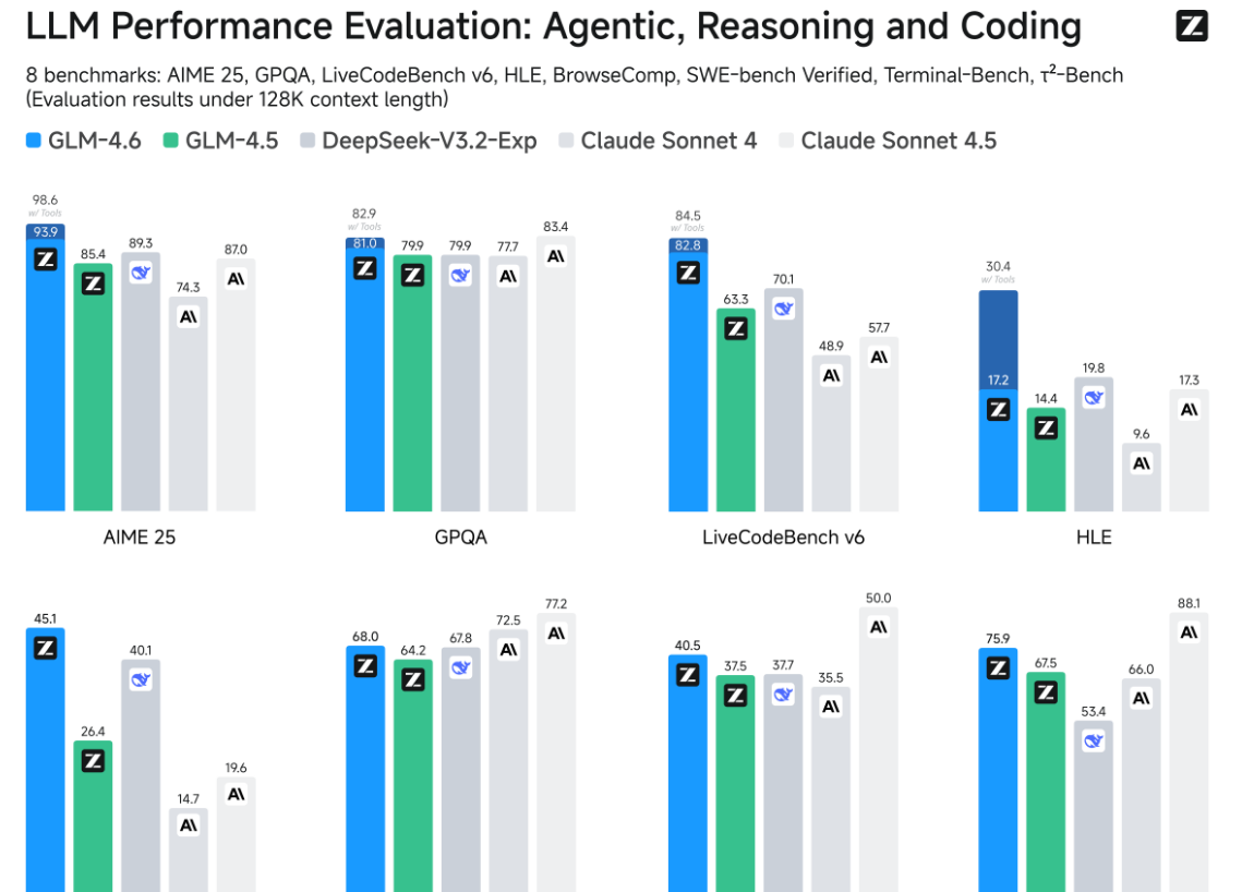在 8 大权威基准:AIME 25、GPQA、LCB v6、HLE、SWE-Bench Verified、BrowseComp、Terminal-Bench、τ^2-Bench、GPQA 模型通用能力的评估中,GLM-4.6 在大部分权威榜单表现对齐 Claude Sonnet 4,稳居国产模型首位