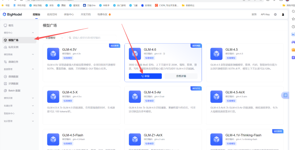 (1)打开模型广场,选择GLM 4.6大模型体验