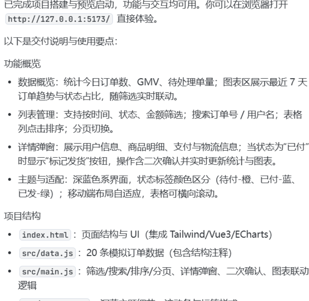 这活儿要是搁以前,光是前端页面加图表起码得两天,现在我喝了杯咖啡的时间就搞定了。而且代码注释也特别给力,像订单状态的标签颜色都写清楚了,后面接真实数据时一看就懂,省了不少沟通成本~