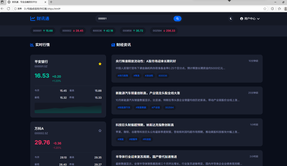 股票卡片 hover 时出现 “数据波动微动效”,新闻卡片点击时有 “资讯展开过渡动画”;