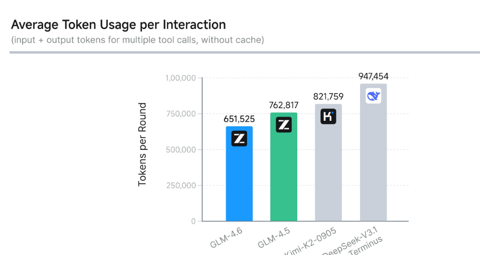 在平均token消耗上,GLM-4.6 比 GLM-4.5 节省 30% 以上,为同类模型最低