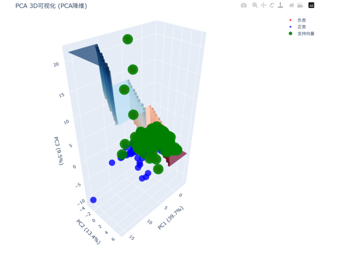 数学模型:使用PCA或t-SNE进行降维,在3D空间中可视化数据分布和决策边界