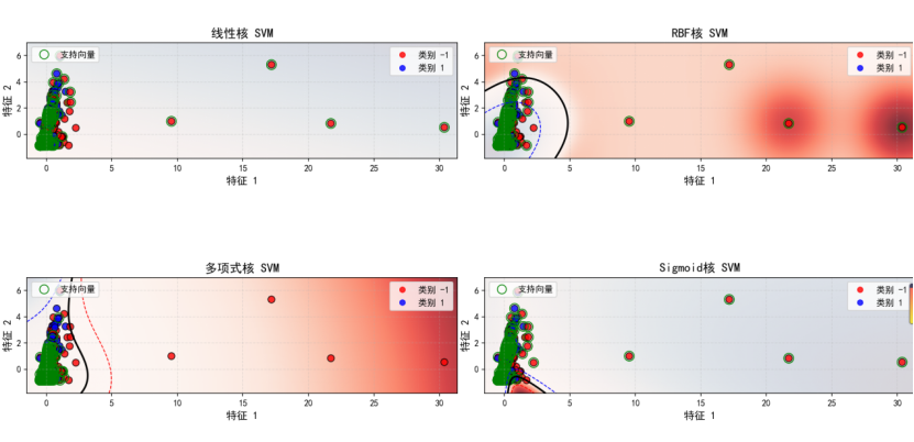 实验中尝试了不同的核函数(线性、RBF、多项式、Sigmoid),对比它们在各类数据集上的表现: