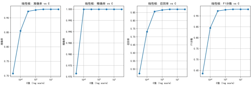线性核 SVM - 准确率: 0.9275, 精确率: 1.0000, 召回率: 0.8657, F1: 0.9280
