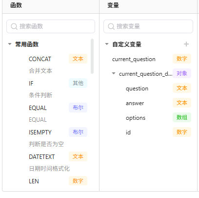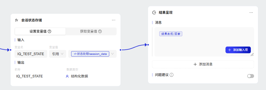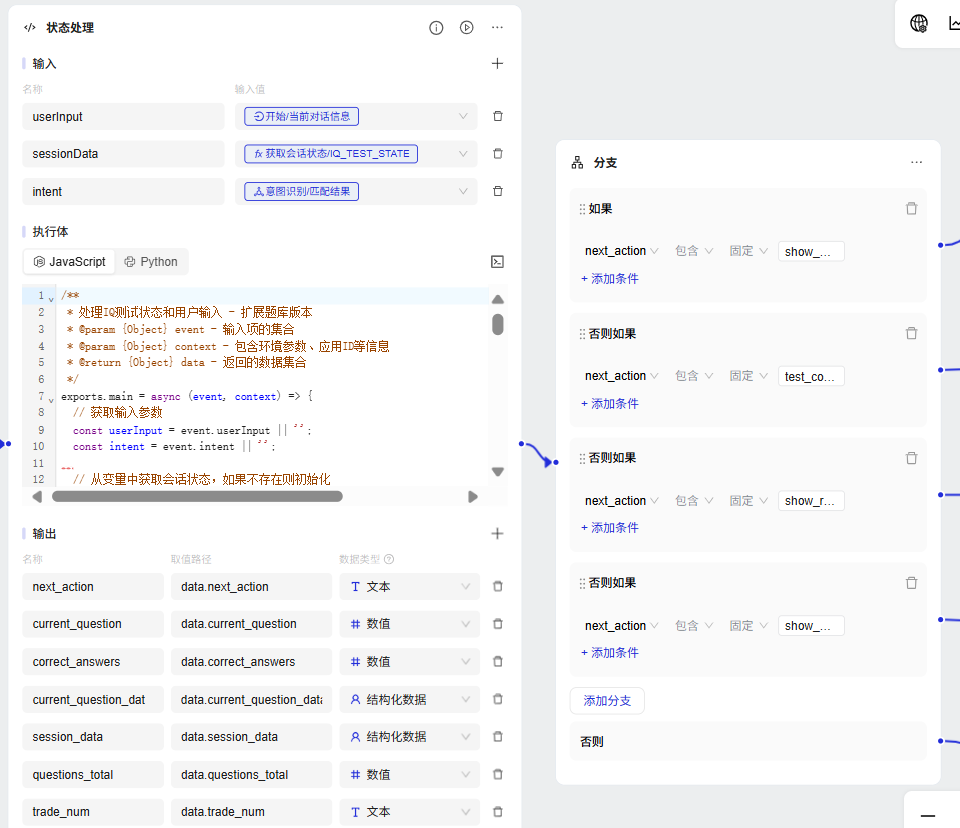 我们需要对会话状态等数据进行配置以及各种参数赋值,例如:current_question,correct_answers,current_question_dat,session_data,questions_total,trade_num等,并根据参数值,判断next_action,来进一步的意图导向,当然这里的状态处理部分还可以嵌入题库知识库,用以动态随机读取(可自行扩展)。