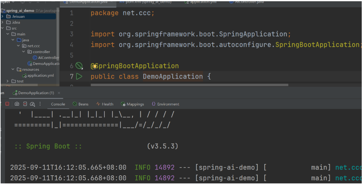 运行SpringAiDemoApplication的main方法,控制台输出以下日志表示启动成功