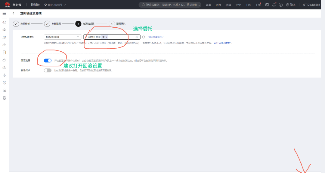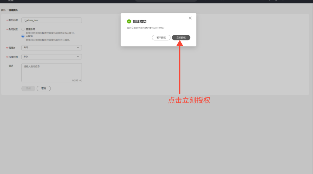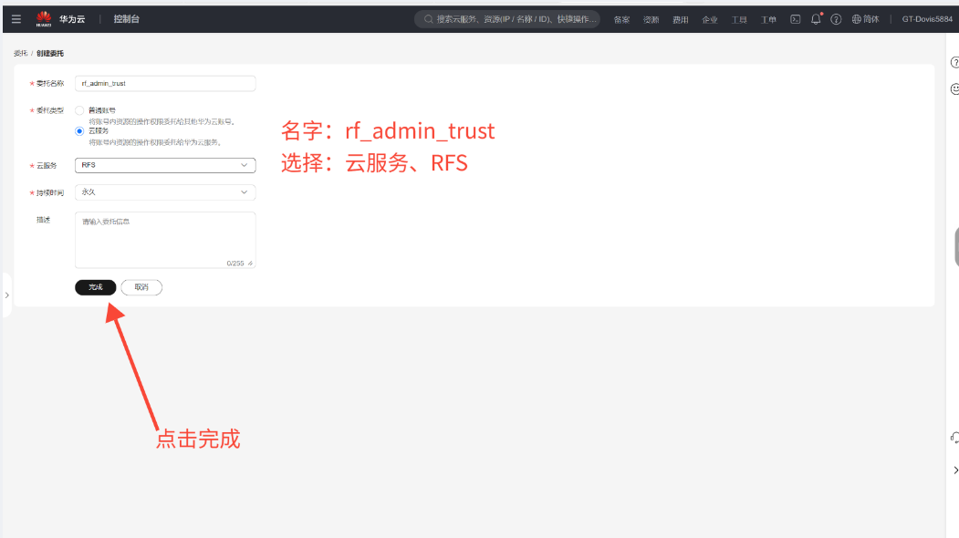 (2)委托名设置为: rf_admin_trust ,选择云服务、RFS资源编排(很重要)