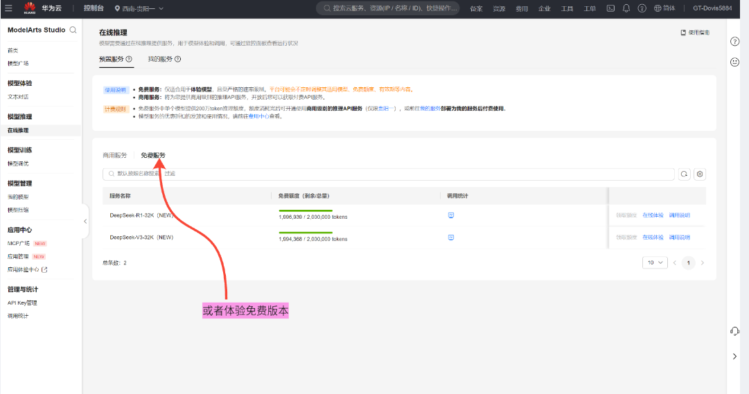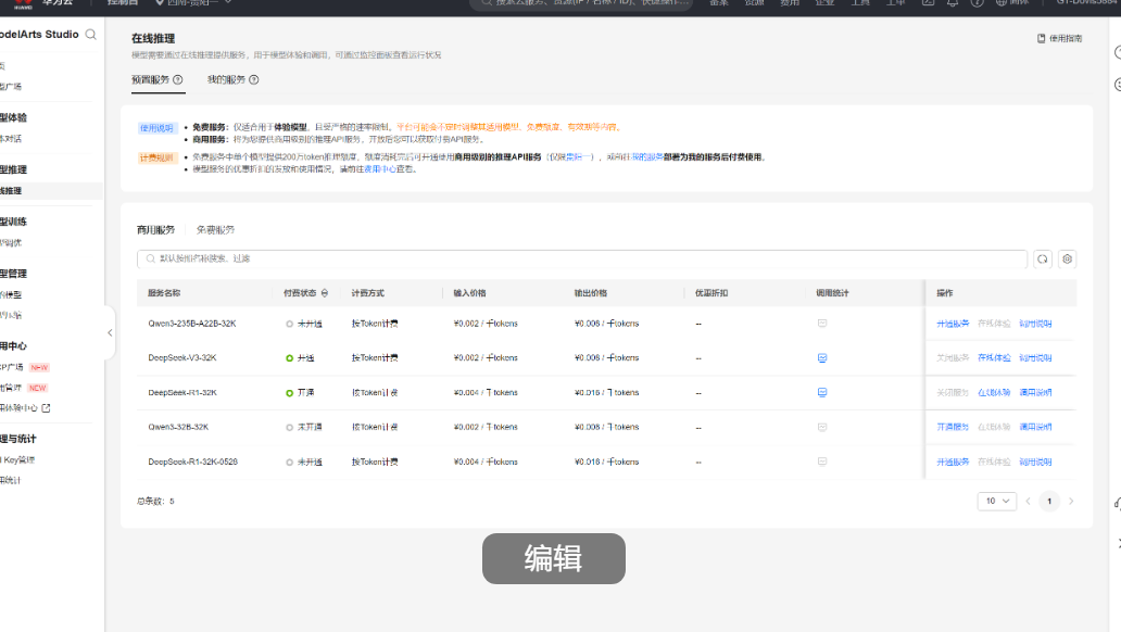 过ModelArts Studio控制台,我仅需几步即可完成服务的开通。页面清晰列出了DeepSeek R1-32K、DeepSeek-V3-32K等服务的状态和操作选项,如“开通服务”或“调优说明”。界面简洁明了,即使是初次使用的开发者也能快速上手。开通后,系统自动分配计算资源,并支持按需调整,极大地提升了开发效率!