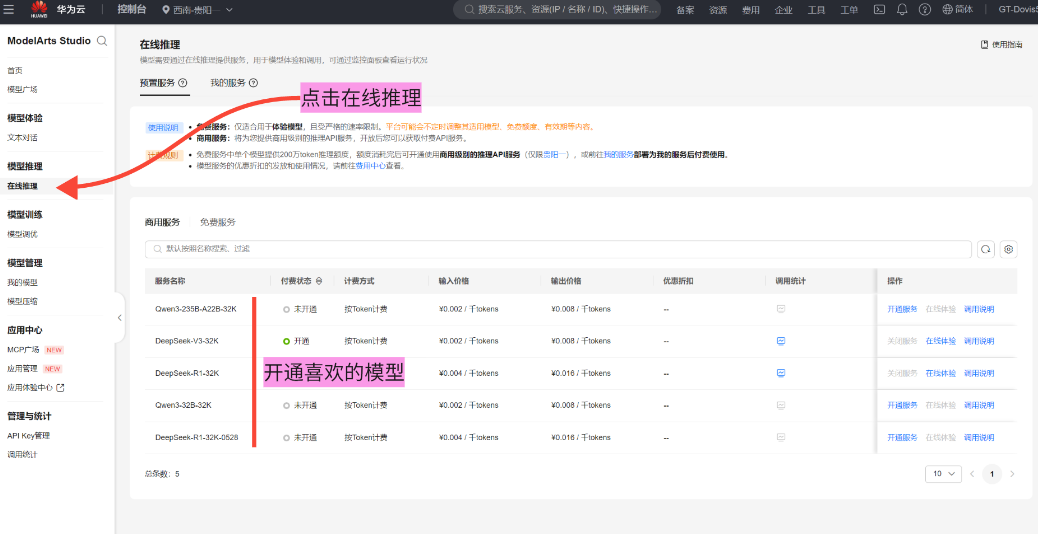(2)再点击在线推理,开通喜欢的模型