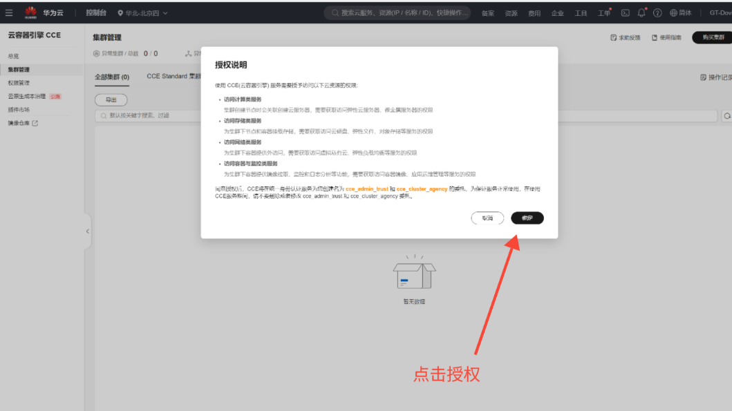 前面我们创建了委托,还需要授权,打开云容器引擎CCE,授权