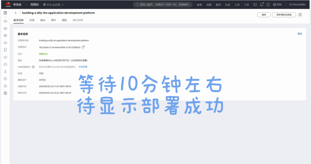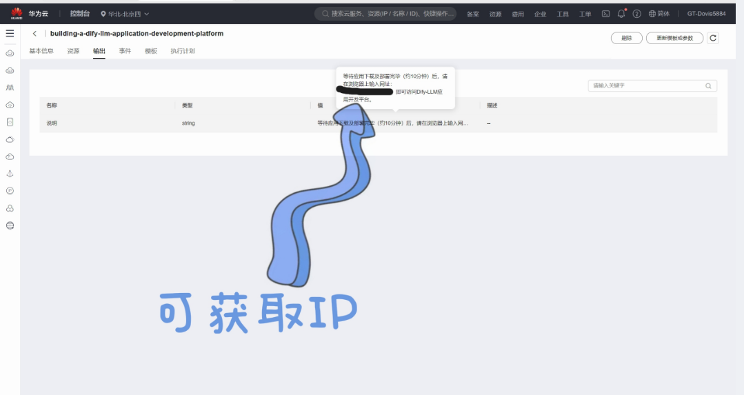 (8)待10分钟左右,会显示部署完成,在“输出”可以查看IP