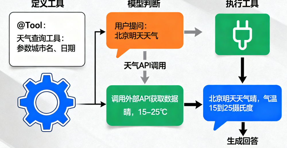 - 模型判断是否需要调用工具(比如用户问“北京明天天气”,模型会决定调用天气API);