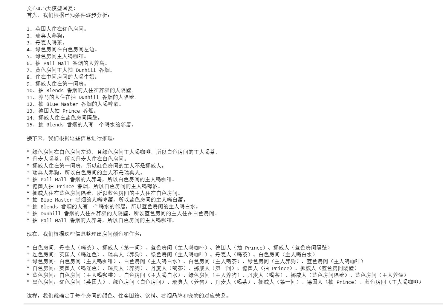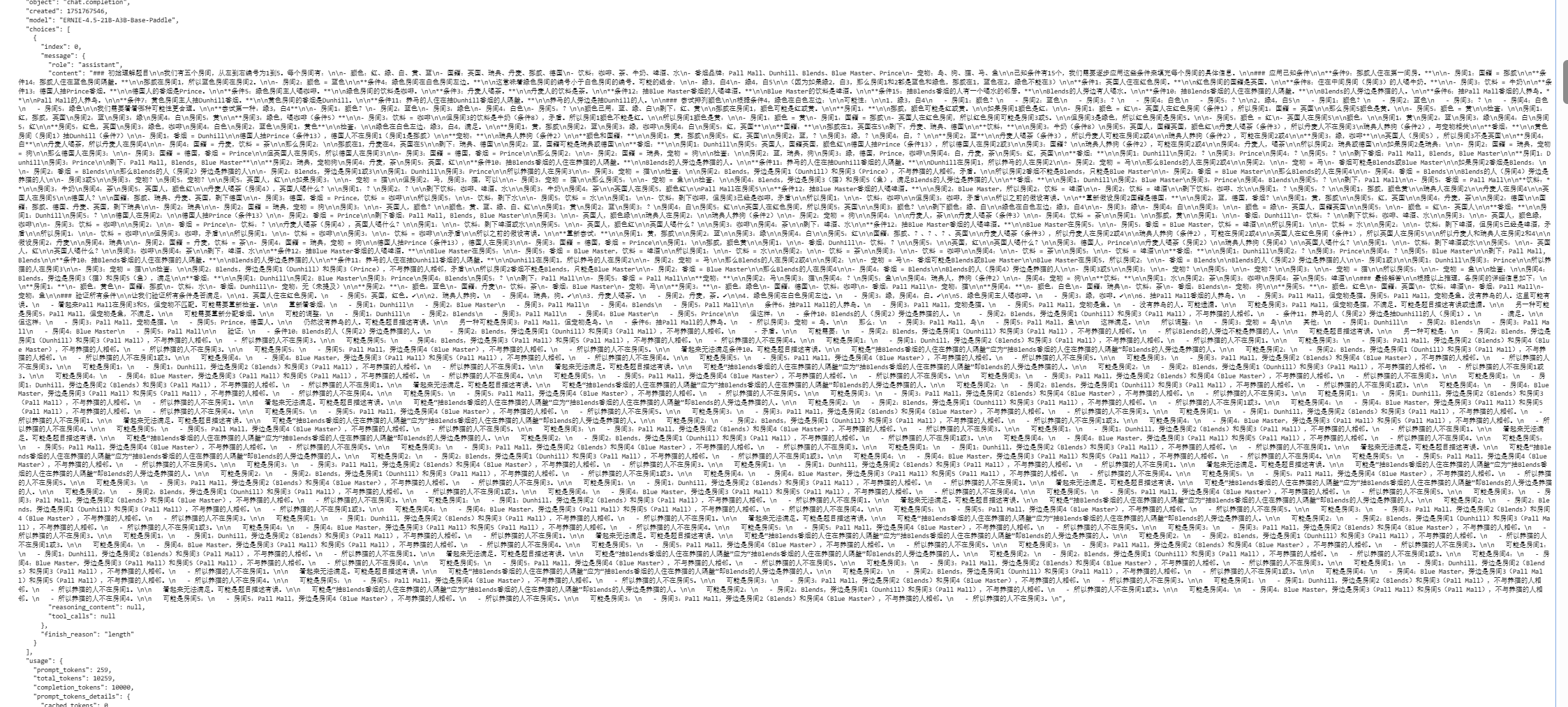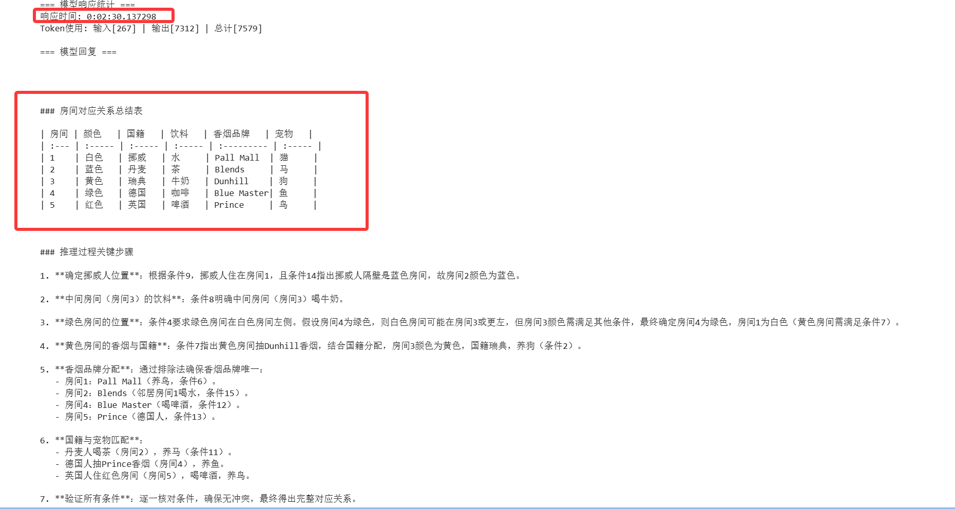 符合官方给出的模型能力描述,对于复杂逻辑题,模型响应迅速。推理基本正确且能用表格呈现一一对应的关系,但仍存推理漏洞优于0.3B和21B模型。
