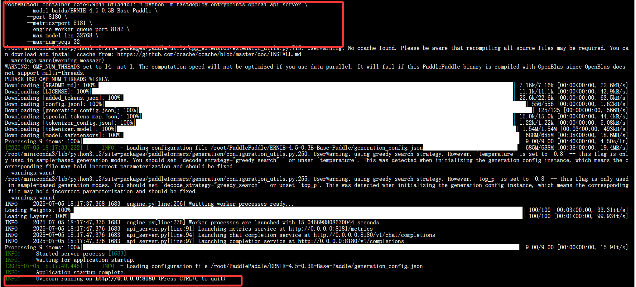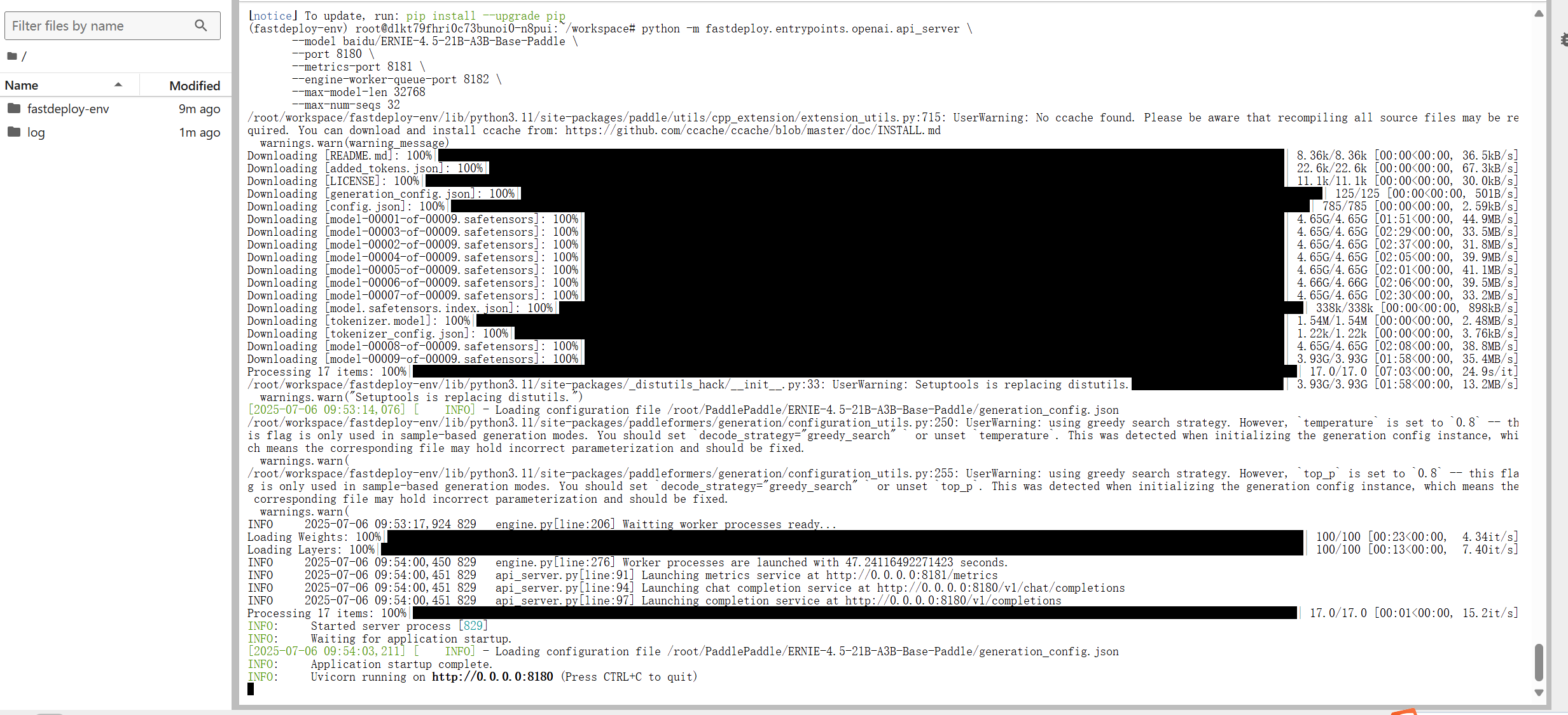 未安装虚拟环境,直接执行指令也会成功,但是有个警告。这是 pip 给出的非强制性警告,以 root 用户(最高权限)运行 pip install,可能导致系统级权限混乱(比如覆盖系统包、权限冲突)。但当前依赖已成功安装(Requirement already satisfied 说明包安装没问题)。 3.2.基础模型部署测试 3.2.1.测试ERNIE-4.5-0.3B-Base-Paddle模型 从Gitcode上拉取模型