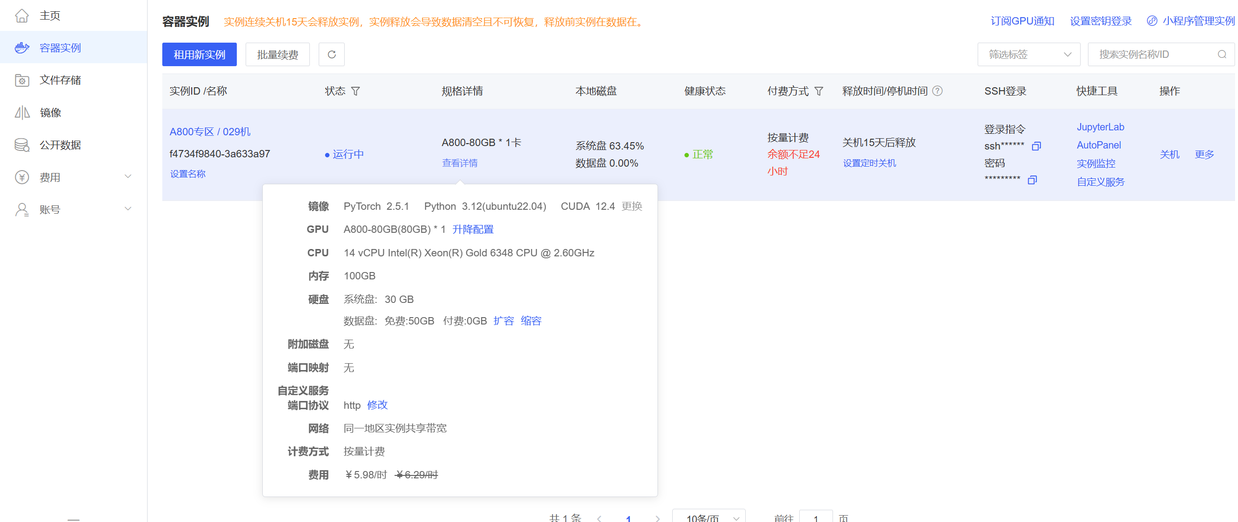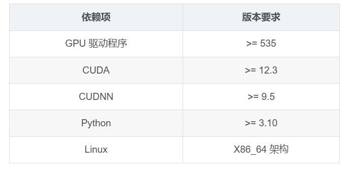 基于 NVIDIA CUDA GPU 安装,需要满足以下环境 注:需要Linux系统,Windows和Mac系统需要基于 Docker 我这里本地环境不能满足以上条件,选择租用一台A100-80G显存服务器来部署模型,下面是选择的硬件配置和基础镜像
