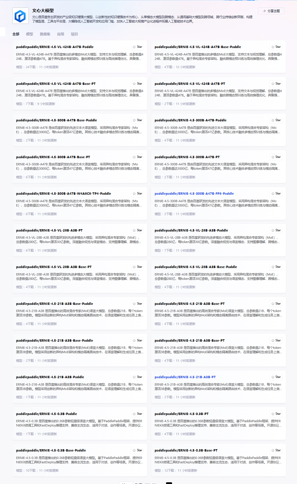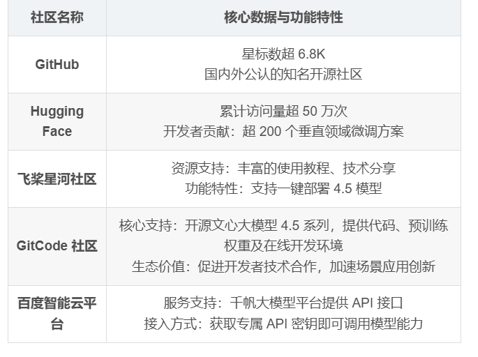 4.1. 开源社区活跃度 GitHub仓库( PaddlePaddle/ERNIE )星标数超6.8K,开发焦点集中于模型压缩、多语言扩展、行业数据集构建等方向。 Hugging Face模型页 累计访问量超50万次,开发者围绕医疗、法律、教育等垂直领域提交超200个微调方案,其中“医疗影像报告生成”“法律文书自动审核”等场景方案下载量突破10万次,展现社区强大创新活力。 飞桨星河社区:作为 百度飞桨 生态的重要组成部分,飞桨星河社区为文心大模型 4.5 的开发者提供了丰富的资源和交流平台。社区内有大量关于文心大模型 4.5 的使用教程、技术分享,在社区可以一键部署使用4.5模型。 GitCode 社区:GitCode 社区 近年来发展迅速,吸引了众多对开源模型感兴趣的开发者。百度选择在此社区开源文心大模型 4.5 系列,使得利用 GitCode 社区 模型应用开发的权重进一步增加。在 GitCode 上,开发者们可以便捷地获取模型的开源代码和预训练权重,利用平台提供的在线开发环境进行模型的调试和应用开发。同时,社区内活跃的交流氛围也促进了不同开发者之间的技术合作,加速了模型在各类场景下的应用创新。 百度智能云平台: 百度智能云千帆大模型平台 为文心大模型 4.5 系列提供了强大的 API 支持。获取专属的 API 密钥,调用模型能力。 4.2. 工具链与生态兼容性 训练工具 :ERNIEKit提供数据预处理、模型压缩、指令精调全流程API,支持LoRA、QLoRA等轻量化技术,企业可完成行业模型定制,大幅降低开发门槛。 部署工具 :FastDeploy支持vLLM与OpenAI协议兼容,通过一行命令启动API服务,无缝对接现有业务系统。 基于以下命令可快速搭建兼容OpenAI接口的本地服务: Plain Bash C++ C# CSS Diff HTML/XML Java Javascript Markdown PHP Python Ruby SQL python -m fastdeploy.entrypoints.openai.api_server --model ./model --port 8080