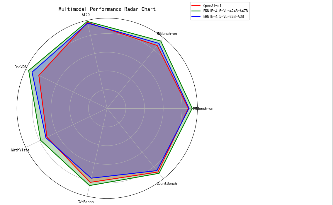 5.1.关键能力深度对比 5.1.1. 多模态理解 ERNIE - 4.5 - VL 系列模型在多模态理解领域展现出较强综合实力,从图中可直观看到,其测评覆盖视觉知识问答、文档图表解析、多模态推理、基础视觉感知以及视频理解等关键维度,各维度表现良好,在与其他模型(OpenAI-o1、Qwen2.5-VL系列)的对比中,呈现出明显的多模态理解竞争力 。