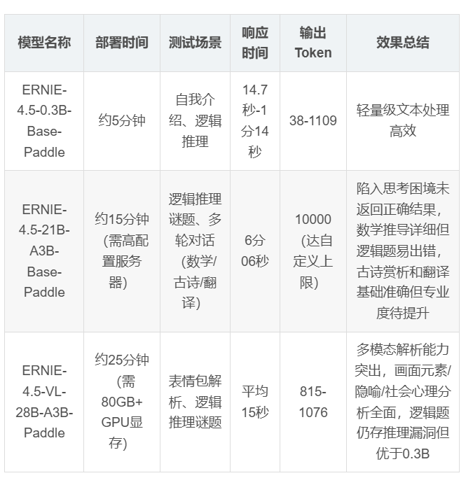 基础模型 :424B参数的ERNIE-4.5-VL-424B-A47B,聚焦多模态复杂推理,在视觉知识理解、跨模态生成等任务中超越DeepSeek-V3-671B强劲开源模型,尤其在医疗影像分析、工业图纸解析等专业领域表现突出。 轻量级模型 :21B参数的ERNIE-4.5-21B-A3B,通过蒸馏大模型核心知识,在数学推理(BBH、CMATH)、指令遵循(IFEval)等任务上以70%参数量实现优于Qwen3-30B的性能,达成效果与效率的最优平衡,适配智能客服、移动办公等轻量化场景。 3.部署实战 文心一言4.5依托飞桨生态构建了从模型获取到落地部署的全链路工具链,支持多元硬件环境的高效适配。先看测评总结: