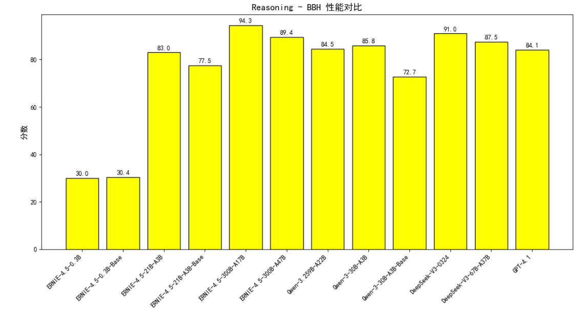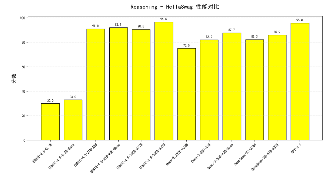 5.1.2. 逻辑推理 在逻辑推理相关的 Reasoning - BBH 和 Reasoning - HellaSwag 测评场景中,ERNIE - 4.5 系列模型展现出扎实的性能表现。在与其他同类型模型的横向对比中,ERNIE - 4.5 系列模型能够稳定输出良好结果,清晰展现出较为突出的逻辑推理能力。充分体现出其在逻辑推理任务维度上具备的竞争力,为处理各类逻辑推理场景提供了可靠的性能支撑 。