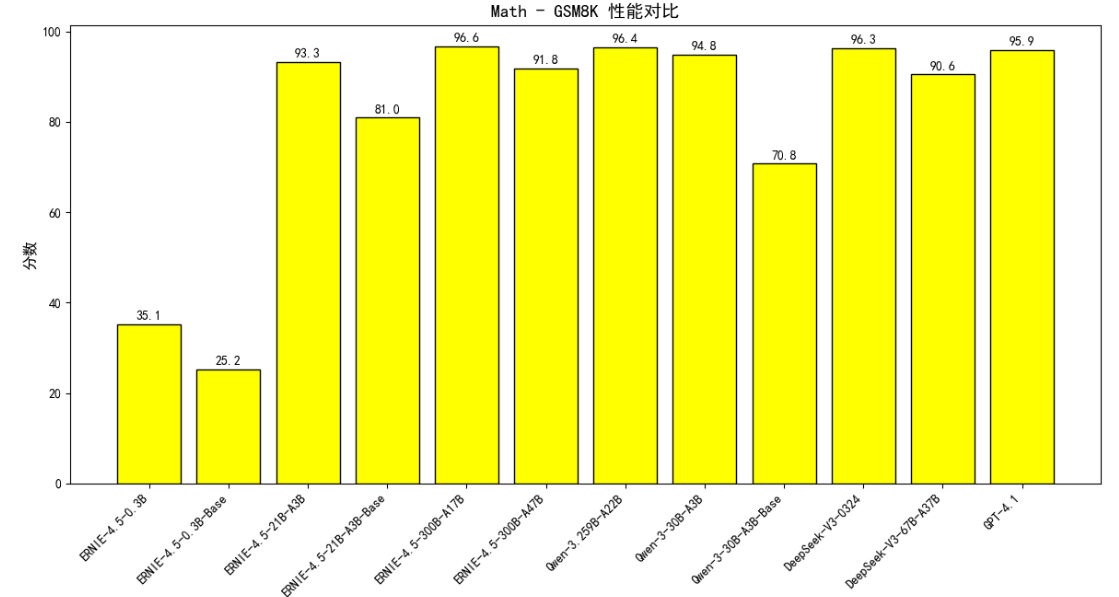 5.1.3. 数学能力 在数学能力测评里,ERNIE - 4.5 系列模型在 Math - GSM8K 和 Math - CMath 测试中表现突出,于同类型模型对比里,展现出较强的数学解题能力优势,在多模型竞争的数学测评场景下,其数学性能值得肯定 。
