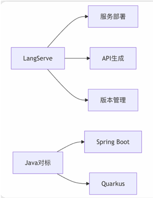 LangServe | 快速服务化:把LangChain应用转成REST API | Spring Boot | 把你写的“洗车建议Agent”转成HTTP接口,供前端调用 | 模型API部署、快速原型验证 |