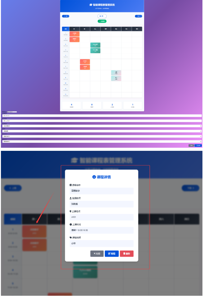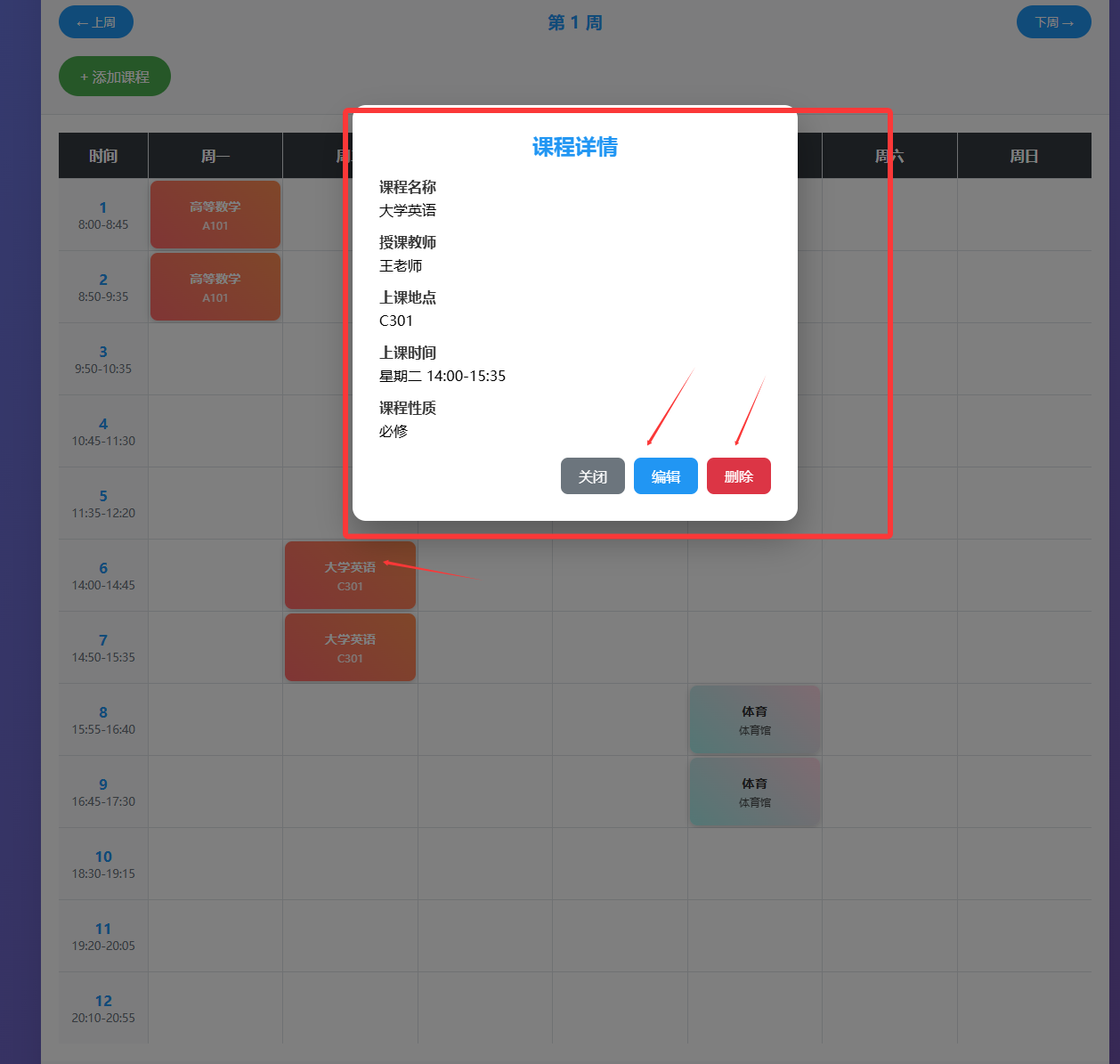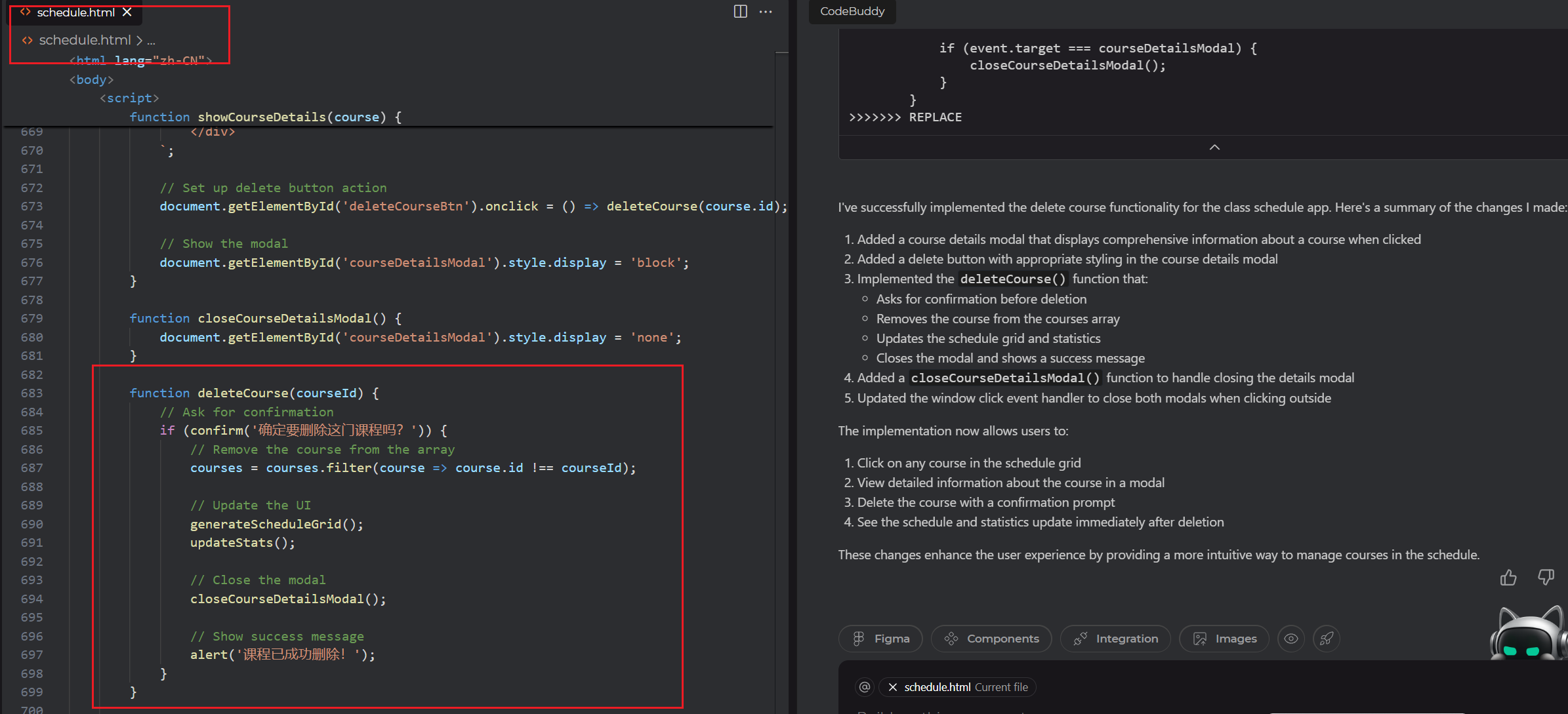这里我没有进行任何别的操作,已经帮我在原代码中添加了“删除课程”的功能,并在左边把修改后的代码呈现出来点击课程,看见多了删除和编辑的功能。