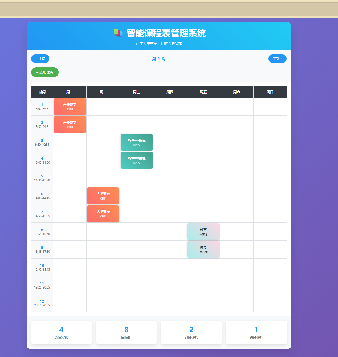 复制网址在浏览器打开后的效果,确实更精美了。课程性质、课次选择和星期选择都是已下拉框形式呈现的,课程详情界面也比以前精致不少。下方新增了可直接添加课程的模块。