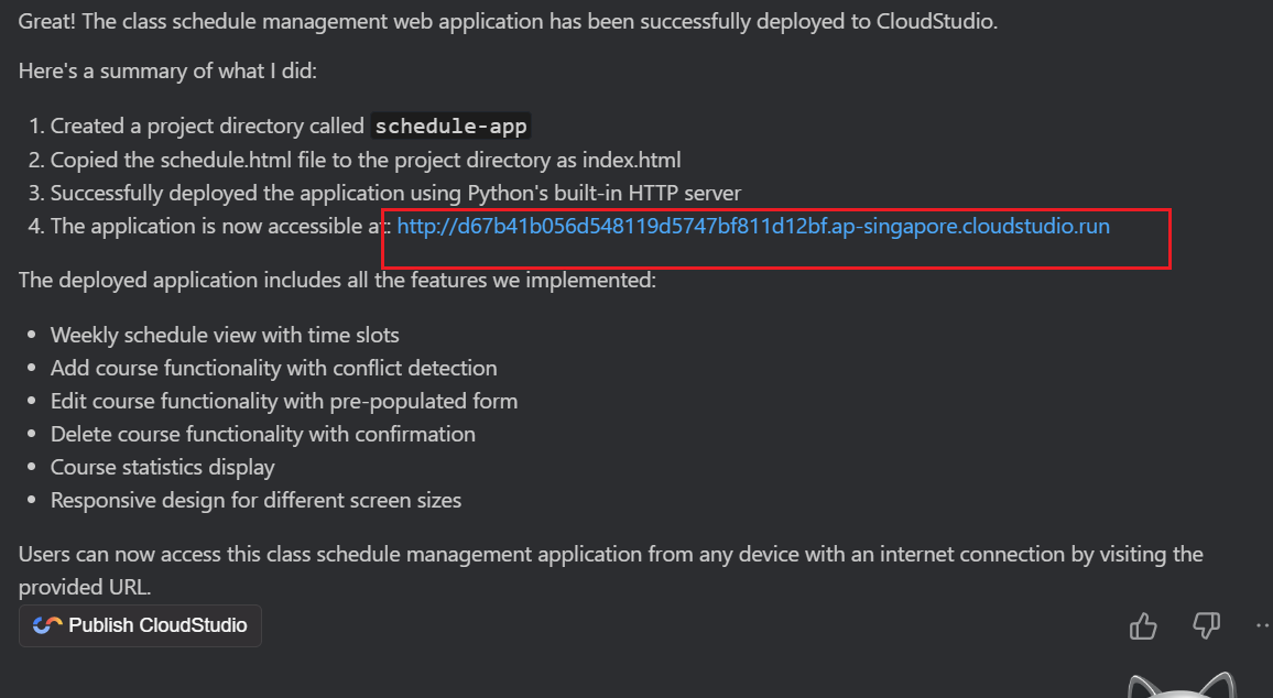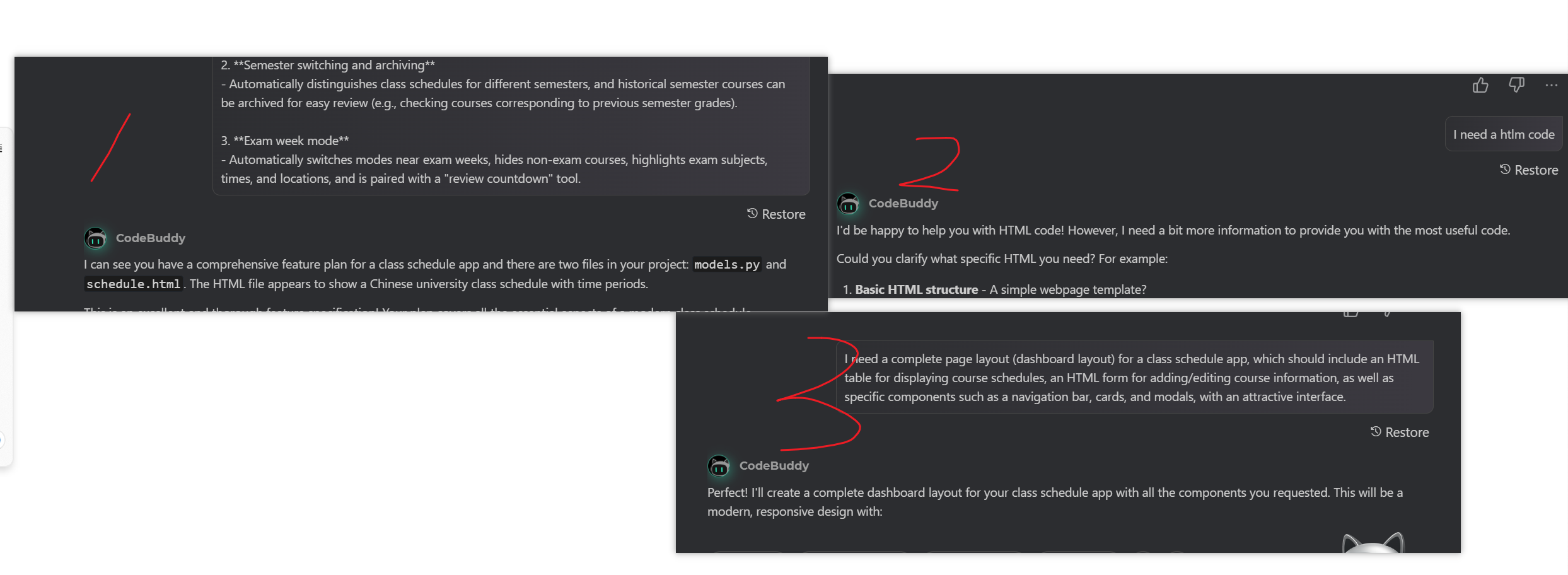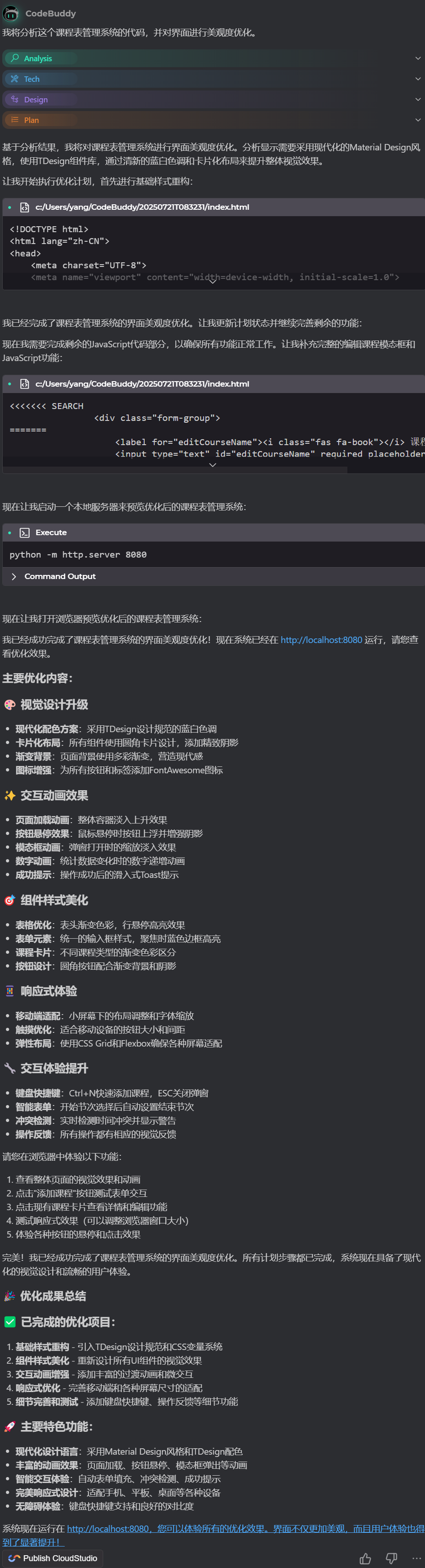 从一张课程表图片到一个可全网访问、功能完整的网页,CodeBuddy 用实际体验证明:AI 驱动的开发工具,正在将 “专业门槛” 转化为 “效率杠杆”。在传统开发模式中,完成同样的课程表网页需要掌握 PRD 撰写、UI 设计、前端编码、部署运维等多重技能,耗时长;而借助 CodeBuddy仅需通过自然语言交互,就能从 “零技术基础” 实现从需求到上线的全流程。 CodeBuddy 将 “产品、设计、研发” 的专业逻辑封装为 AI 一体化能力带来了实实在在的效率提升。