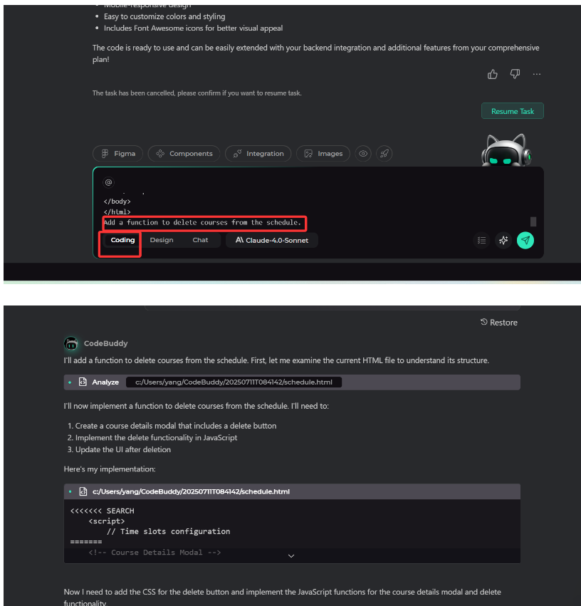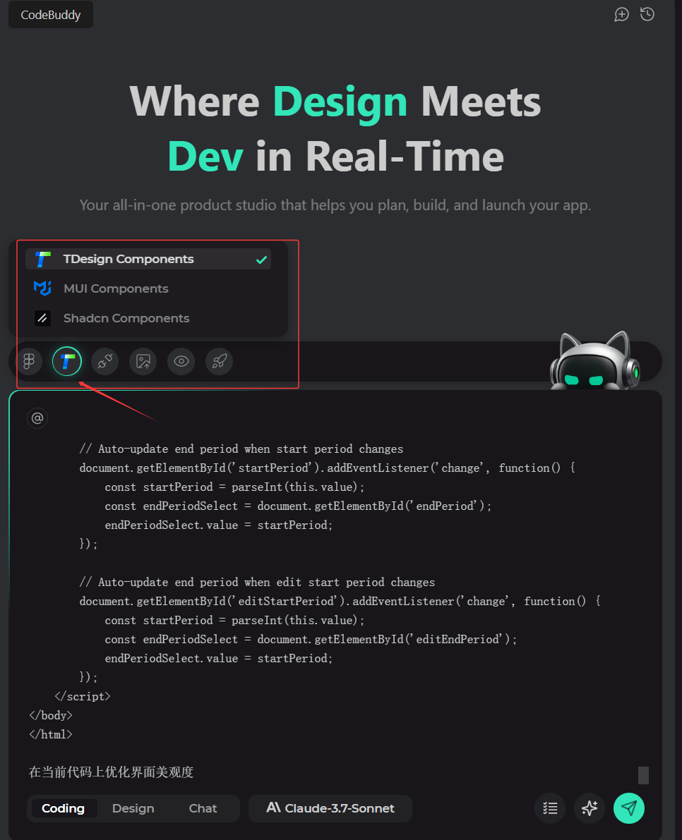 codebuddy给我们提供组件库选择与调用能力,助力开发者快速搭建界面。有TDesign Components、MUI Components、Shadcn Components主流组件库可以选择,适配不同技术场景。将我们原本的课程表页面代码交给codebuddy。选择腾讯开源的企业级设计体系TDesign,其与 CodeBuddy 协同工作、深度融合,复用成熟组件库,减少重复开发。