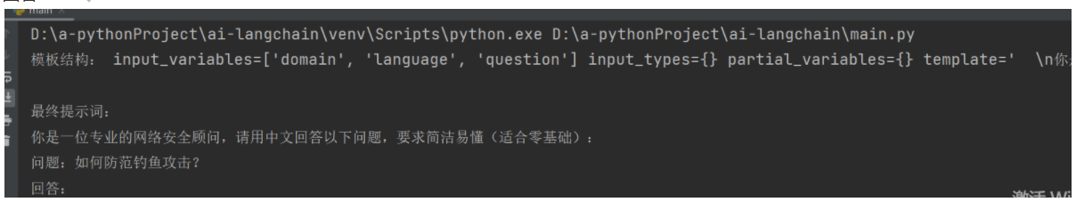 运行效果预期: 最终提示词会变成: “你是一位专业的网络安全顾问,请用中文回答以下问题,要求简洁易懂(适合零基础): 问题:如何防范钓鱼攻击?